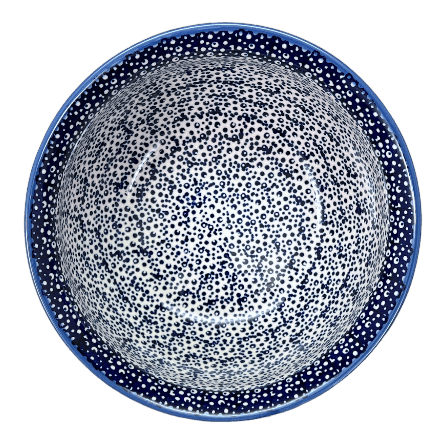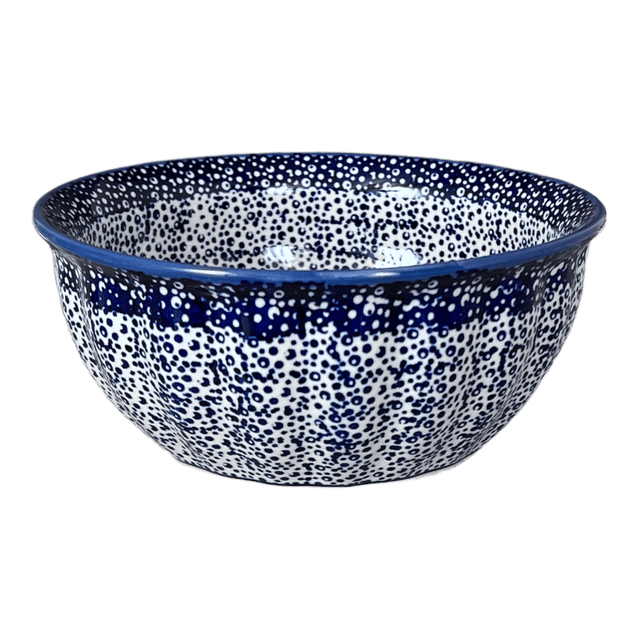 This particular design, featuring tiny blue dots and rings densely packed across a white background, is a testament to the traditional level of Polish pottery artistry. These patterns, created through the meticulous "punching" technique of hand stamping, are inspired largely by the beauty of nature. Though considered "simpler" in the realm of Polish pottery, the traditional patterns have a charm that lies in their familiarity and the subtle variations introduced by different artists. With each bowl holding up to 44 ounces, your kitchen will not only gain a functional piece but also a conversation starter that varies slightly from one piece to another, adding to its unique charm.