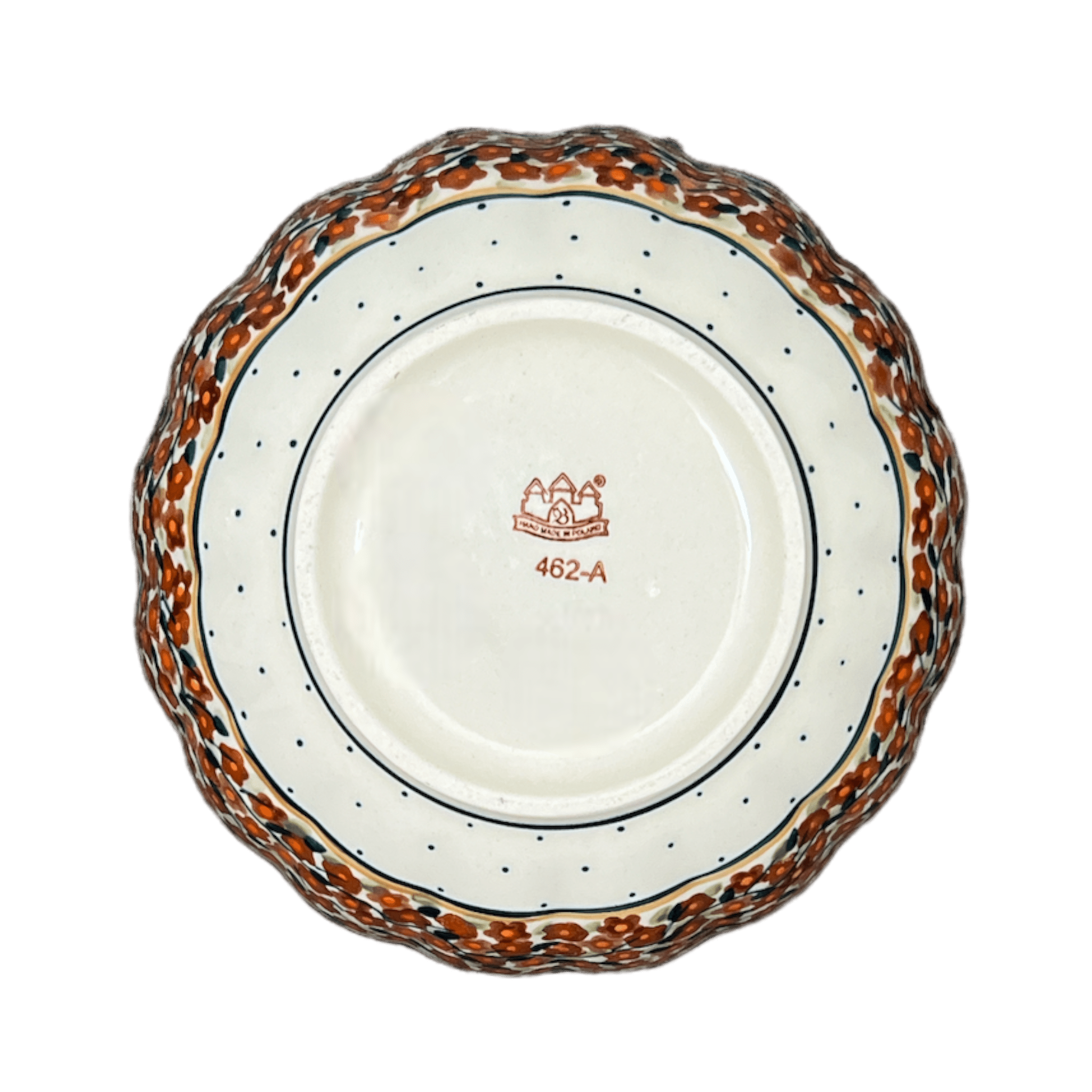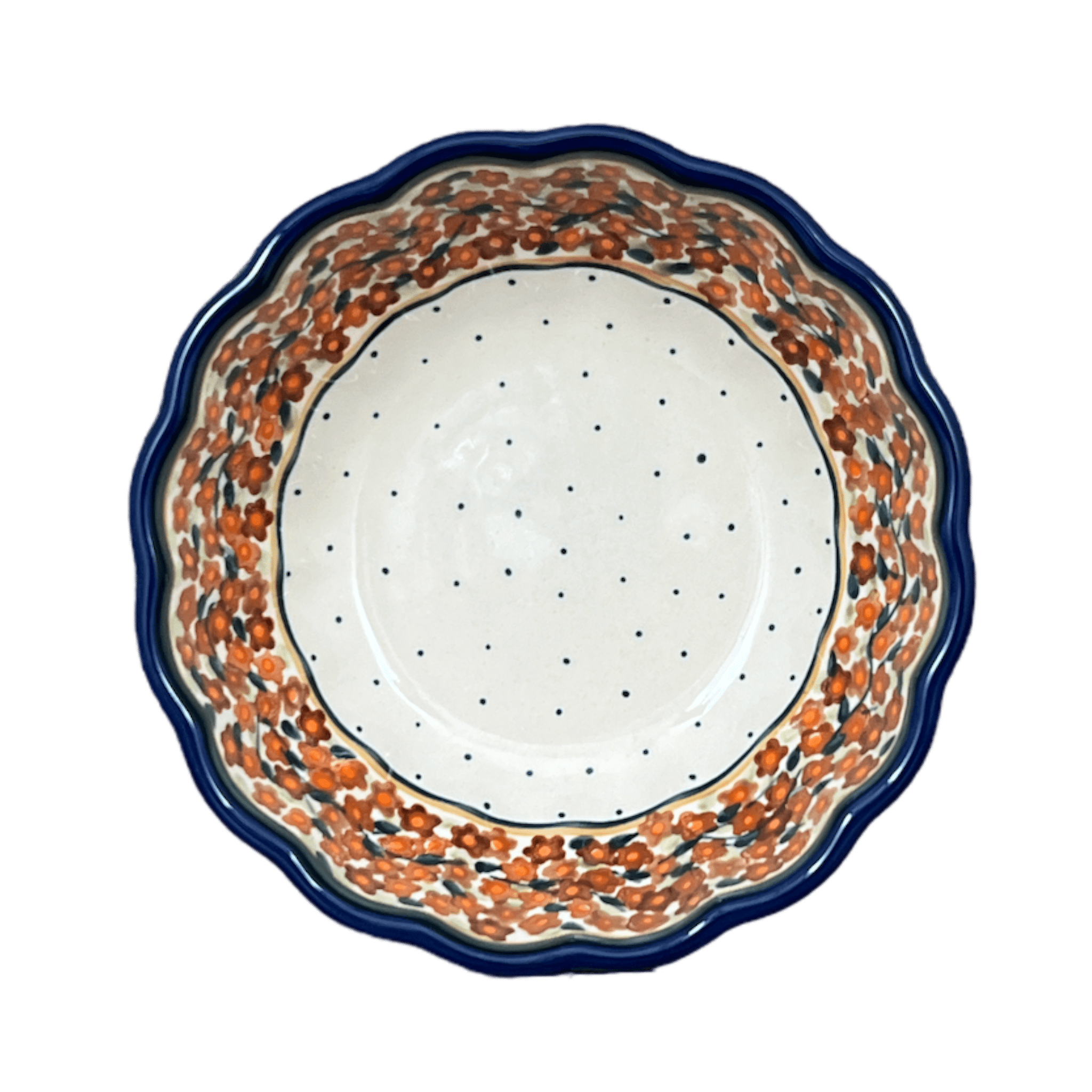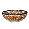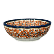 Imagine a table adorned with the vibrant charm of the Polish Pottery Bowl from Zaklady, capturing the essence of a quaint European blossom festival right in your dining room! This delightful 7-inch bowl, crafted in the "Orange Wreath" pattern, is a feast for the eyes with its rich brown backdrop and lively splashes of orange, green, and white. The design features an enchanting ring of golden flowers encircling green leaves, with a center that dances with tiny brown dots. It’s not just a bowl; it’s a piece of art that promises to elevate your meal presentations and enchant your guests with its unique beauty.