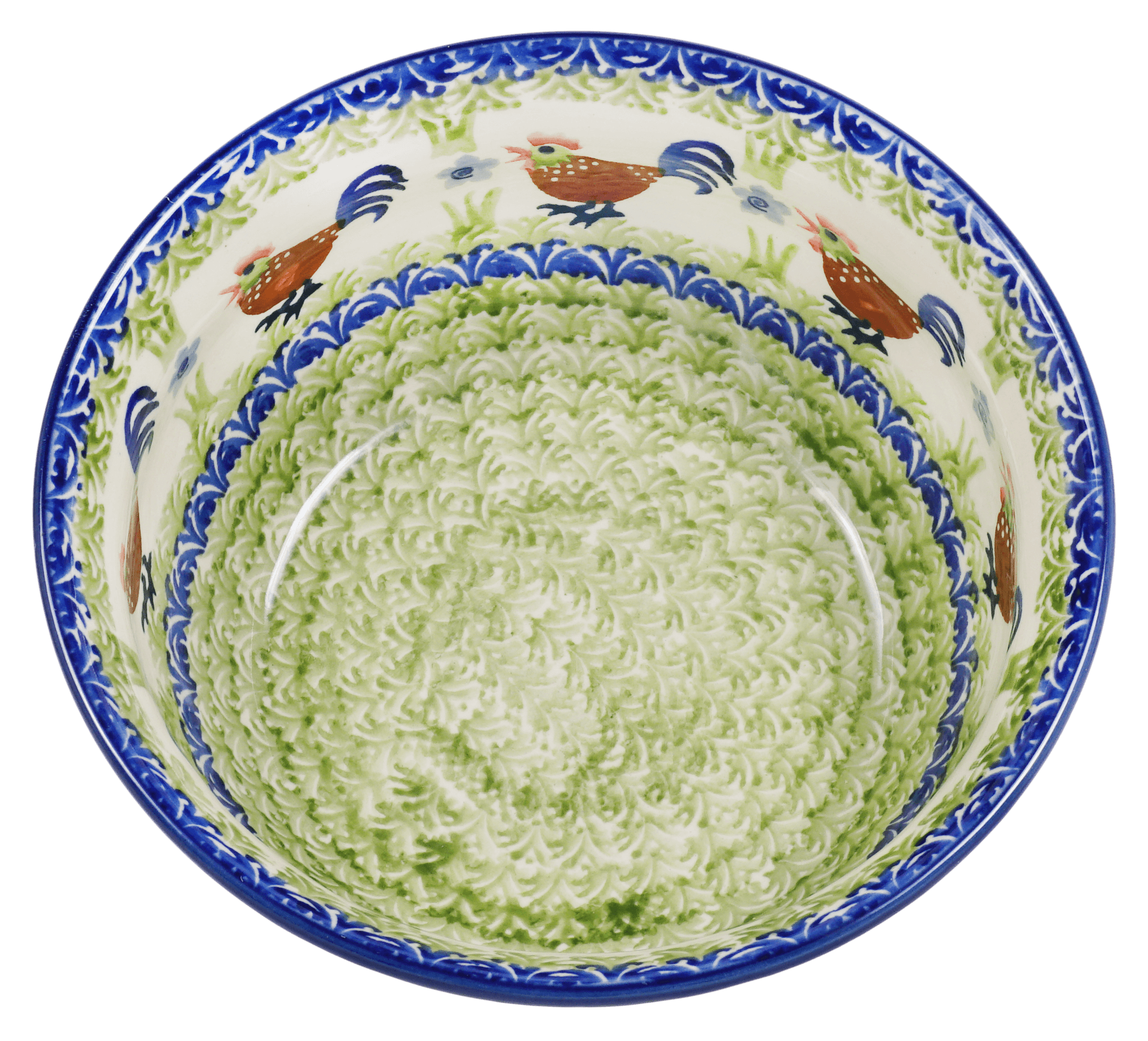 Introducing the enchanting Polish Pottery Bowl from Manufaktura, a masterpiece that dances the "Chicken Dance" right into your kitchen! This 7.75" round bowl, adorned with the whimsical "Chicken Dance" pattern, is your perfect companion for whipping up vibrant salads, hearty pastas, or even mixing dough. Picture this: large brown chickens with quirky green heads and teal blue tails, all prancing counterclockwise amidst a backdrop of lush green grass and delicate light blue flowers. This isn't just a bowl; it's a storytelling piece that brings a splash of fun and color to every meal!