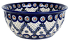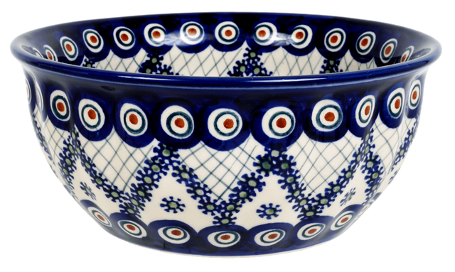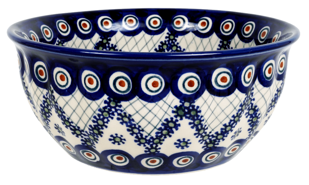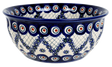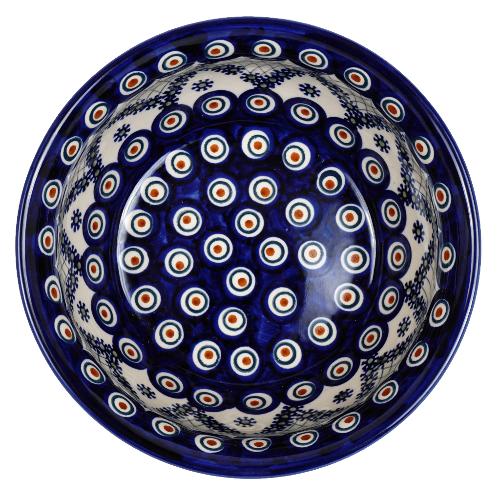 Introducing the enchanting "Fancy Peacock" Polish Pottery Bowl from Manufaktura – a delightful canvas of artistry perfect for bringing life to your dining table! With its 7.75" diameter, this bowl is ideally sized for tossing up vibrant salads, twirling a serving of aromatic pasta, or even mixing your favorite dough. Handcrafted in the heart of Boleslawiec, Poland, this bowl isn't just a dish; it's a centerpiece that promises to captivate with its striking blue hues and intricate peacock and geometric patterns. Dive into the depth of its design, where peacock dots dance on a sapphire background, encircled by triangles adorned with blue and green blossoms set against a pristine white backdrop.
