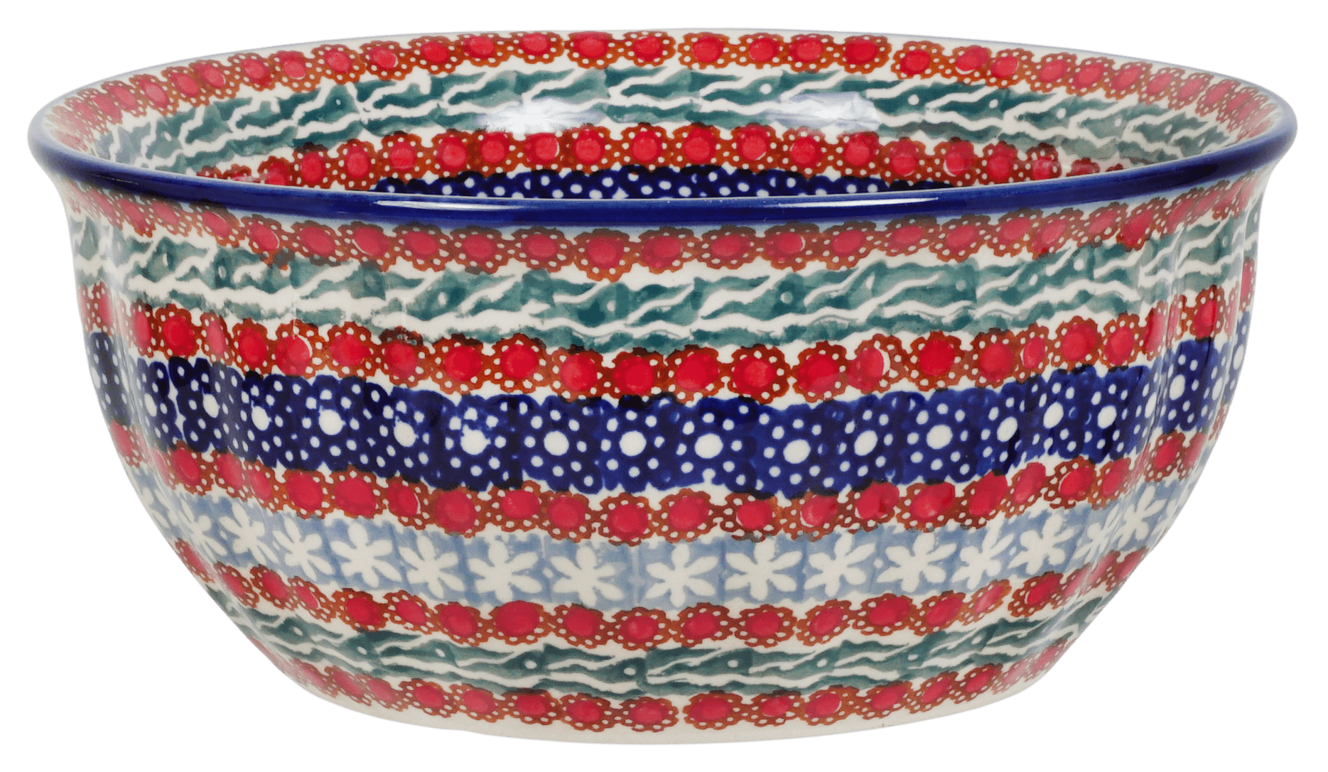 Let's talk about the "Fanfare" pattern, shall we? Picture a burst of geometric shapes dancing in a sea of red, with delightful accents in shades of green and dark blue. But that's not all - the center of the bowl is surrounded by bands of teal, light blue, and dark blue, adorned with simple yet charming floral designs. It's like having a mini masterpiece right in your hands!