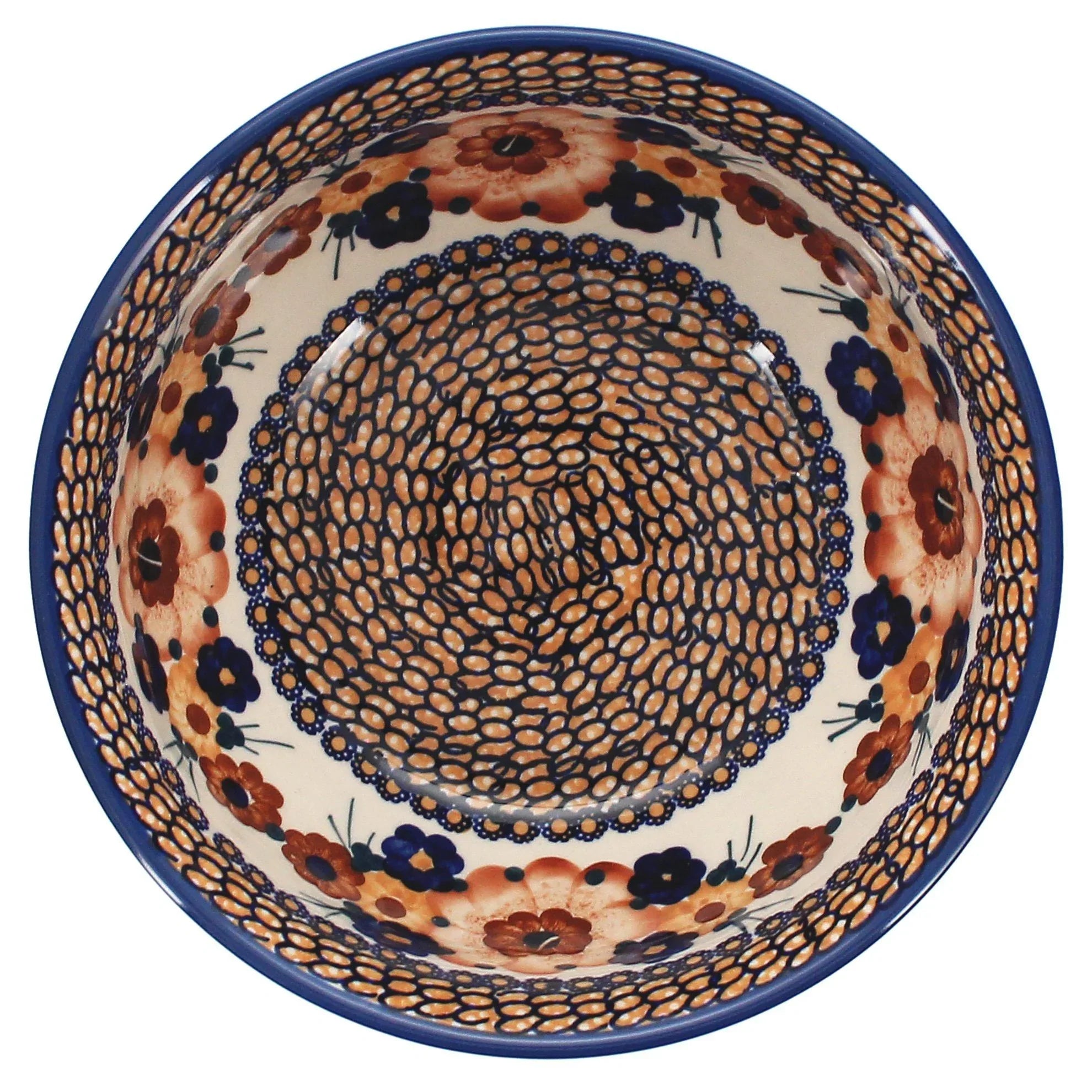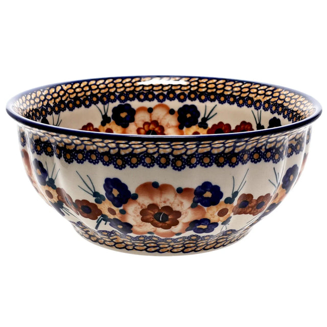 Introducing the Manufaktura 9" Polish Pottery Bowl, a true masterpiece from the heart of Boleslawiec, Poland. Not just any bowl, this exquisite piece, adorned with the "Bouquet in a Basket" pattern, transforms everyday dining into a vibrant feast for the eyes. Imagine the rich, earthy tones of brown, interspersed with playful blues, peaches, and whites, coming alive in your kitchen! This pattern isn't just about color; it tells a story through its large, detailed peach-colored flowers and a delicate chain of smaller flowers in blue, yellow, and orange, dancing around the center. Whether you're tossing a fresh salad, stirring a hearty stew, or mixing up your favorite cake batter, this bowl turns every kitchen task into a celebration of artistry.