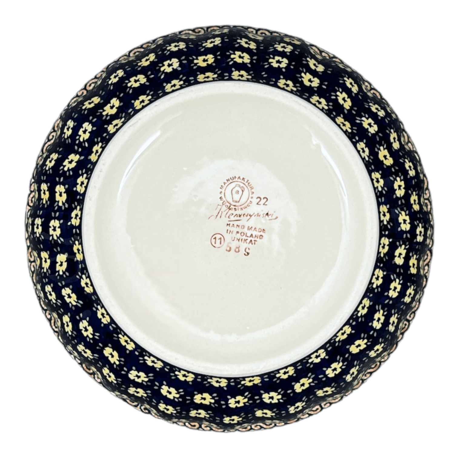 Each of these bowls is a canvas where top-tier artists from Manufaktura, a trailblazer in the Polish pottery scene since 1992, showcase their masterful skills. The "Floral Formation" pattern is a testament to their prowess, featuring detailed elements like dark blue grass blades and delicate yellow flowers, all set against a dramatic blue backdrop. Such exquisite detail is not just seen but felt, as each piece is meticulously hand-painted by artisans who have reached the pinnacle of their craft in Boleslawiec, Poland. Not just made, but lovingly created, each bowl carries the "UNIKAT" stamp—Polish for "unique"—alongside the artist's signature, marking it as a limited edition collector's item.