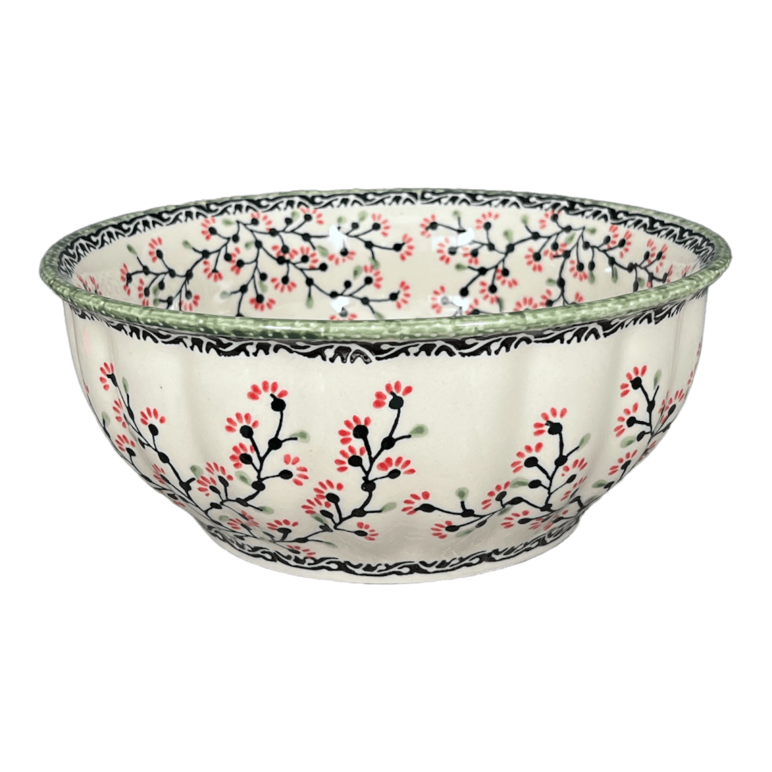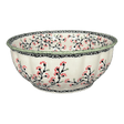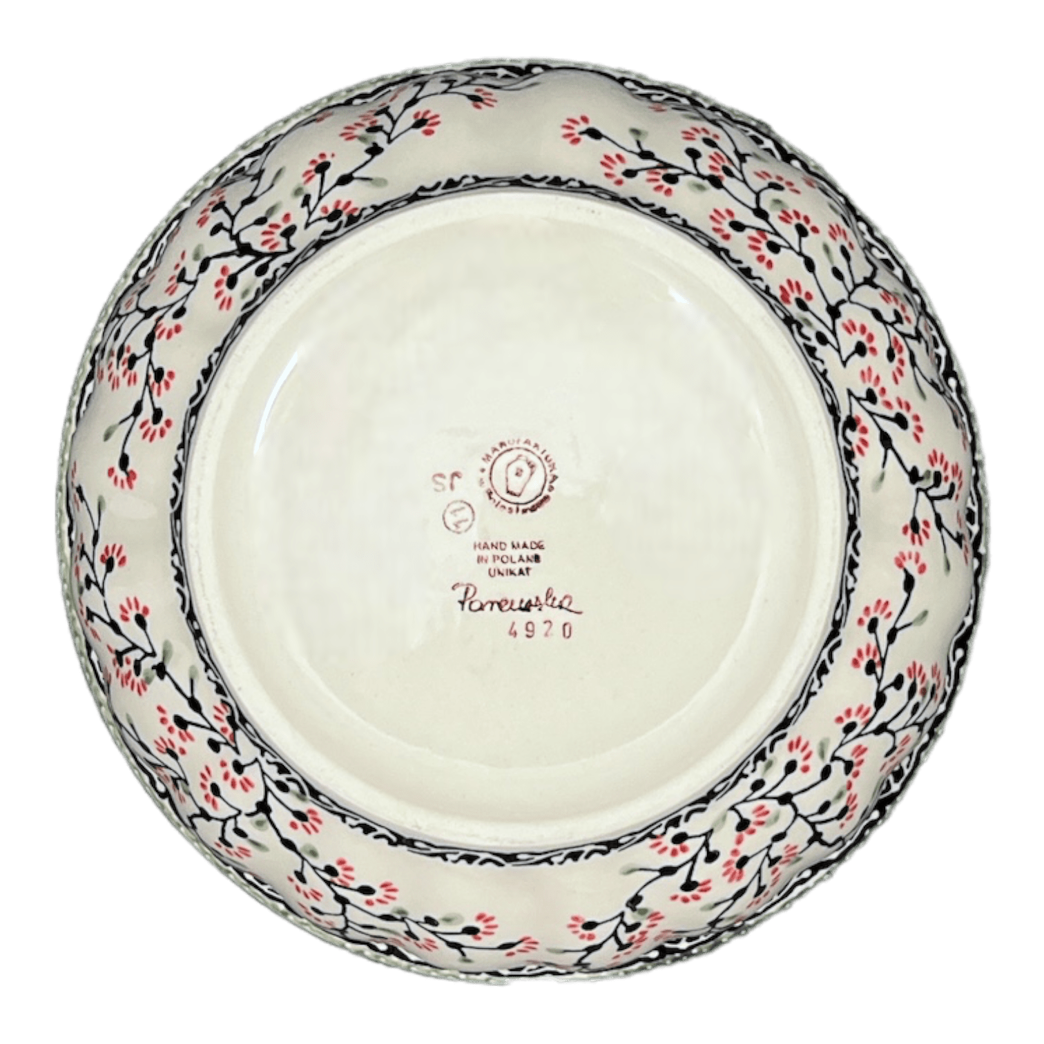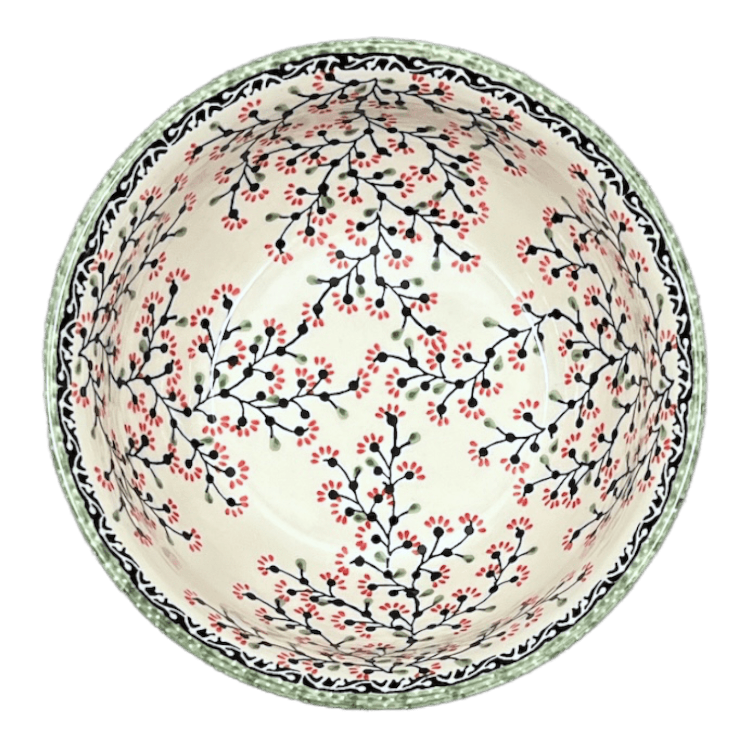Introducing the Polish Pottery 9" Bowl by Manufaktura in the captivating "Cherry Blossoms" pattern (DPGJ). This bowl is not just your ordinary serving dish, it's a versatile piece that can be used for salads, pastas, stews, and even as a mixing bowl! The "Cherry Blossoms" pattern is a visual delight, with its vibrant red flowers, lush green accents, and bold black and white designs. It's like having a piece of art right on your table!