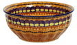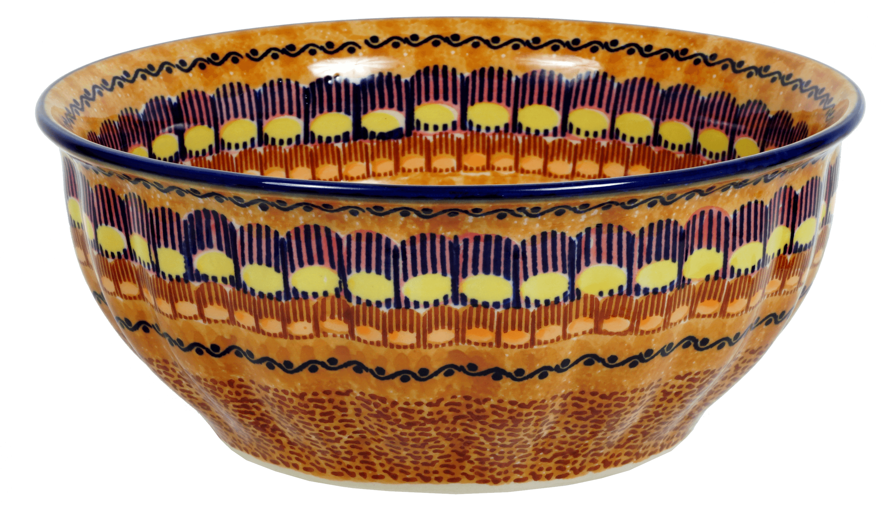 Introducing the Polish Pottery 9" Bowl by Manufaktura in the captivating "Desert Sunrise" pattern (KLJ). This versatile bowl is not only perfect for serving salads, pastas, or stews, but it also doubles as a fabulous mixing bowl! The "Desert Sunrise" pattern boasts a harmonious blend of geometric shapes in a rich brown color, complemented by vibrant accents in orange, blue, and yellow.