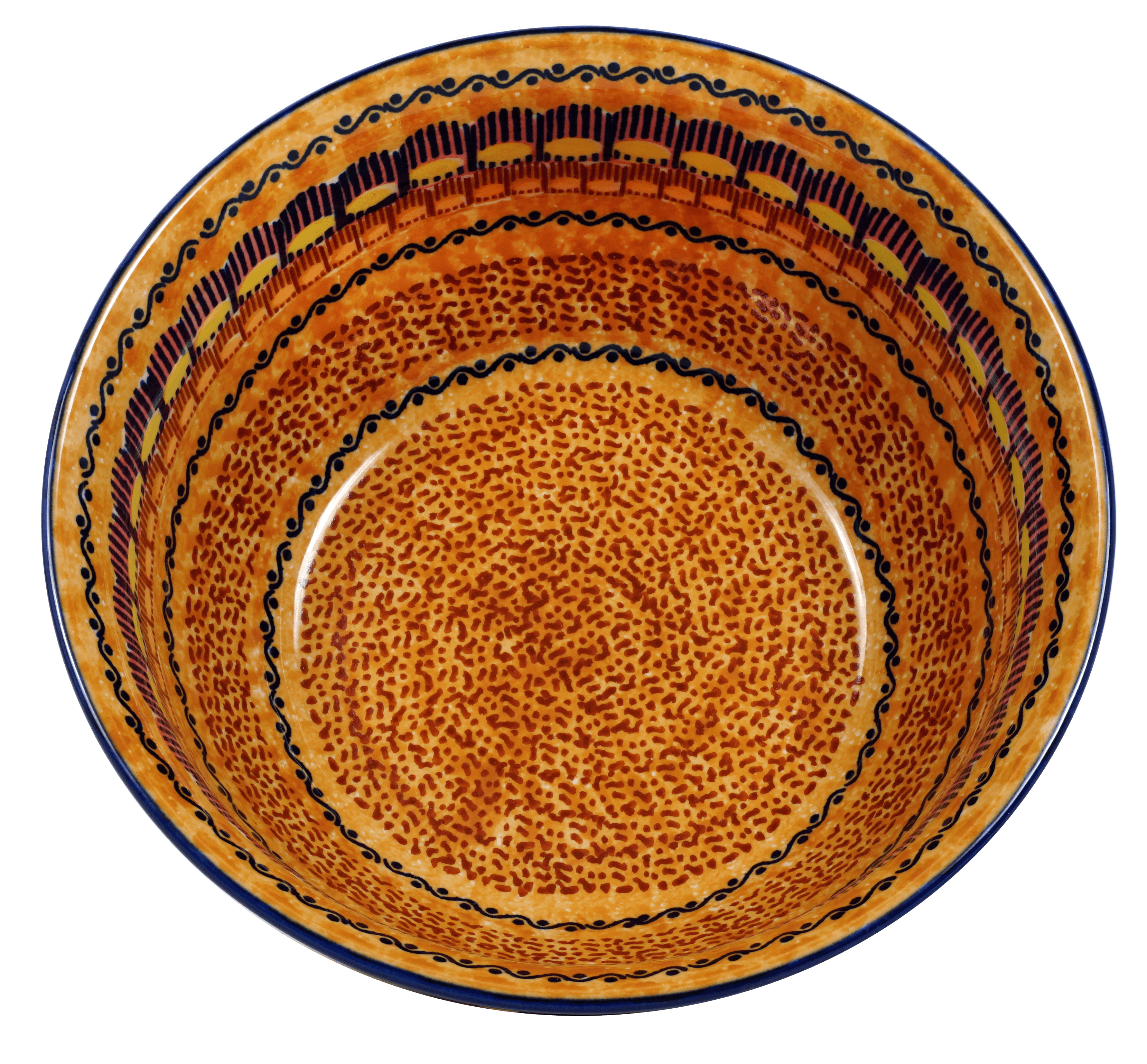 With a generous capacity of 64 oz. (8 cups) and dimensions of 9" in diameter and 3.75" in height, this bowl is both functional and beautiful. It is meticulously crafted and hand-painted in Boleslawiec, Poland, by highly skilled artisans who take pride in their craft. Polish Pottery is renowned for its ability to seamlessly blend functionality with aesthetic appeal, and this bowl is no exception. It is the perfect way to add vibrant splashes of color to your home and impress your guests with stunning combinations when mixed and matched with other Polish Pottery pieces.