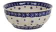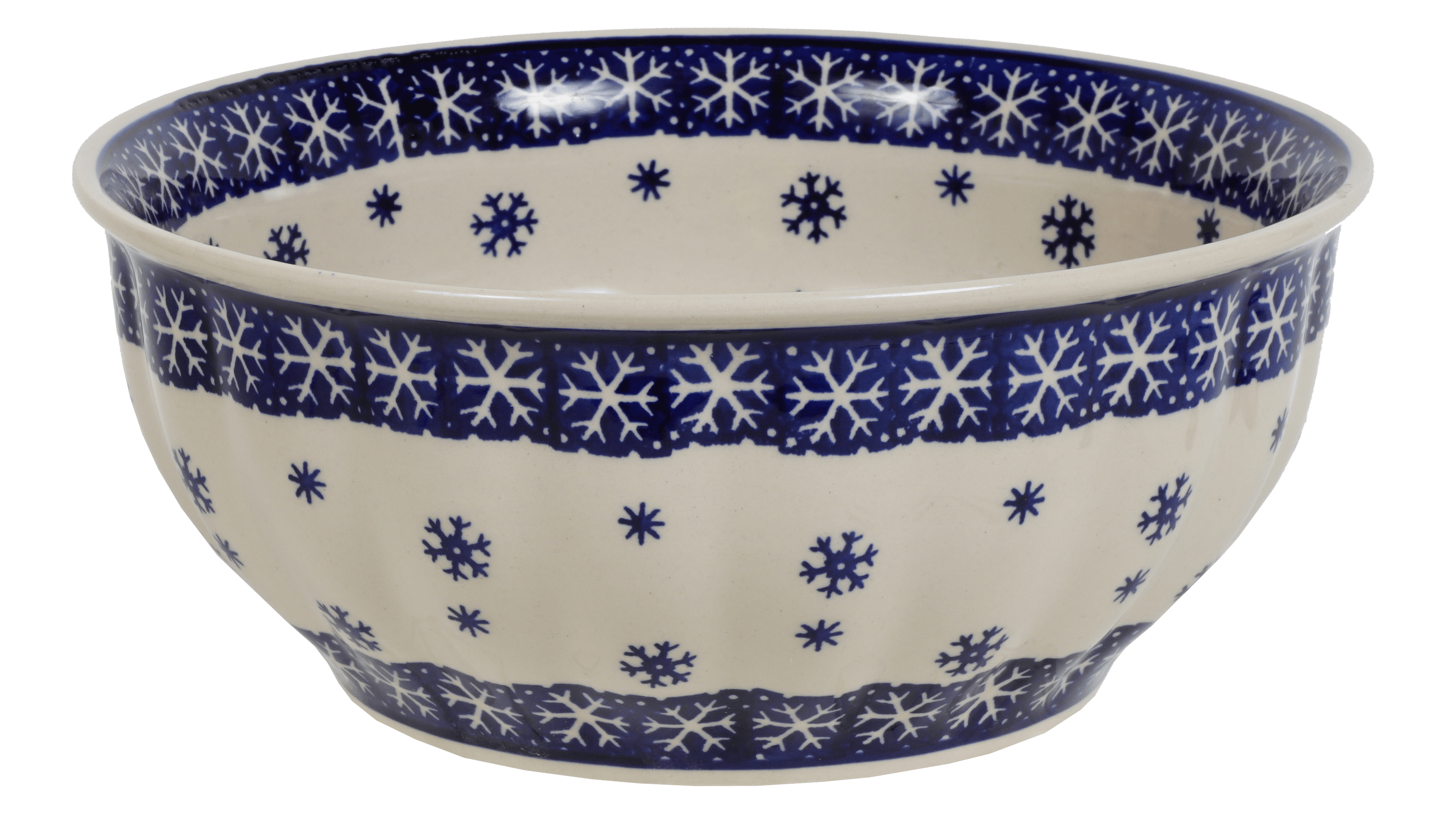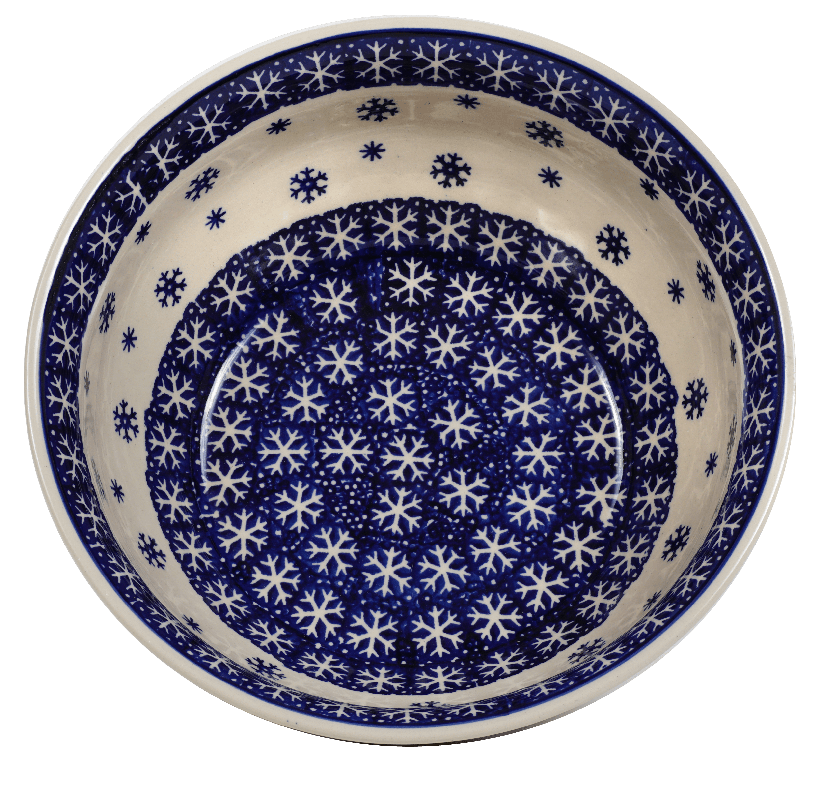 The "Snow Drift" design is a playful dance of white snowflakes set against a serene blue backdrop, with a scattering of blue snowflakes around the exterior, evoking the quiet beauty of a snowy evening. The pattern falls into the Traditional category, a testament to designs that have adorned Polish pottery for generations. Despite its classic roots, each bowl varies slightly due to the individual artistry of the painters using the "punching" technique of hand stamping, ensuring that no two pieces are exactly alike. Not only is this bowl a piece of art, but it's also built to last, crafted from materials that are chip-resistant, and safe for the dishwasher, microwave, and even the oven up to 425 degrees Fahrenheit.