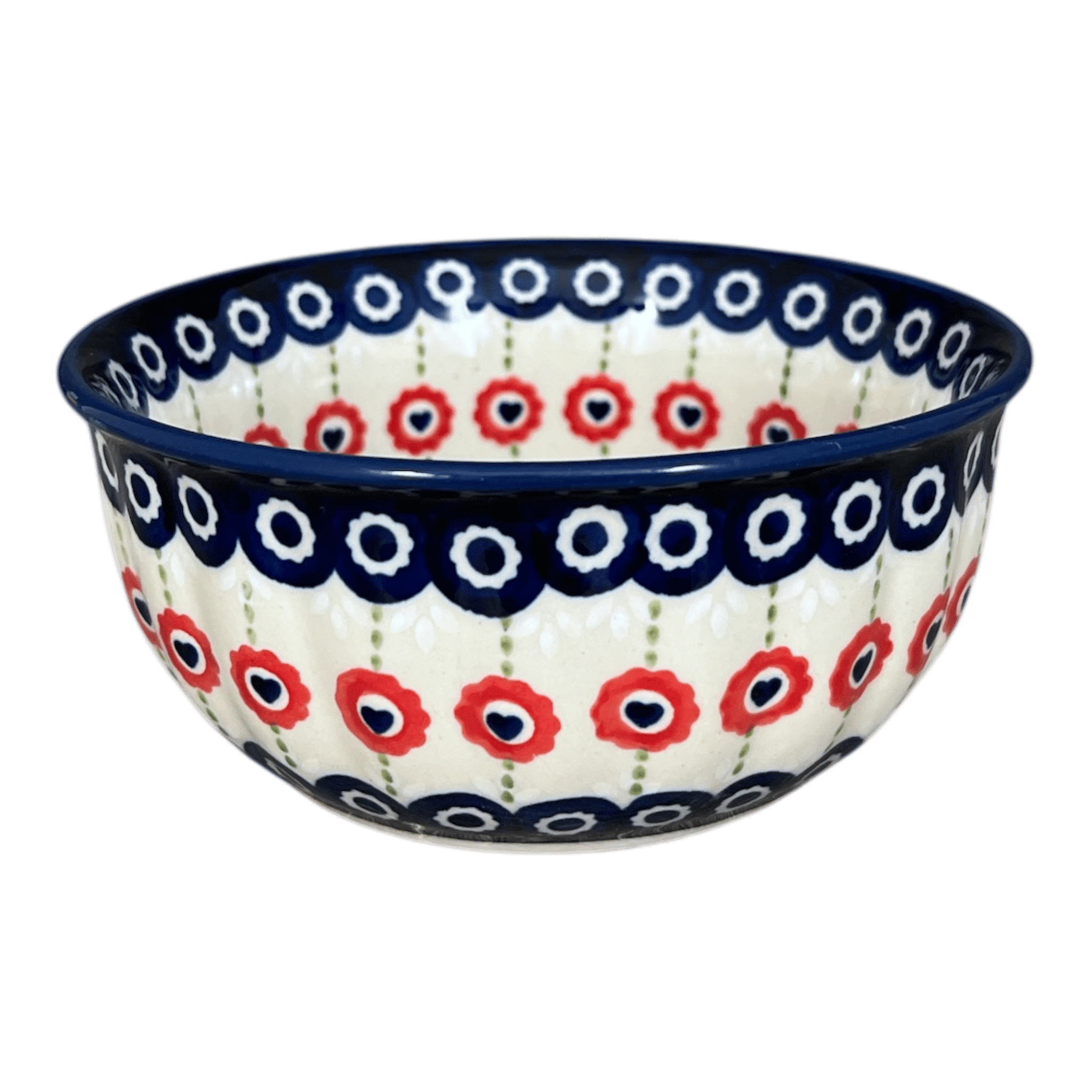 Immerse yourself in the charm and vibrancy of the "Hearts in Bloom" pattern with this enchanting 5.5" Polish Pottery Bowl from Manufaktura. A delightful medley of cobalt blue floral dots, radiant blue hearts encircled by red floral accents, and whimsical green dotted lines, this bowl turns every meal into a festive occasion. Whether it's a steamy bowl of soup, a refreshing salad, or your favorite dessert, this bowl serves up joy with every bite. Crafted in Boleslawiec, Poland, this piece isn't just a bowl, but a portal to a world of floral fantasy!