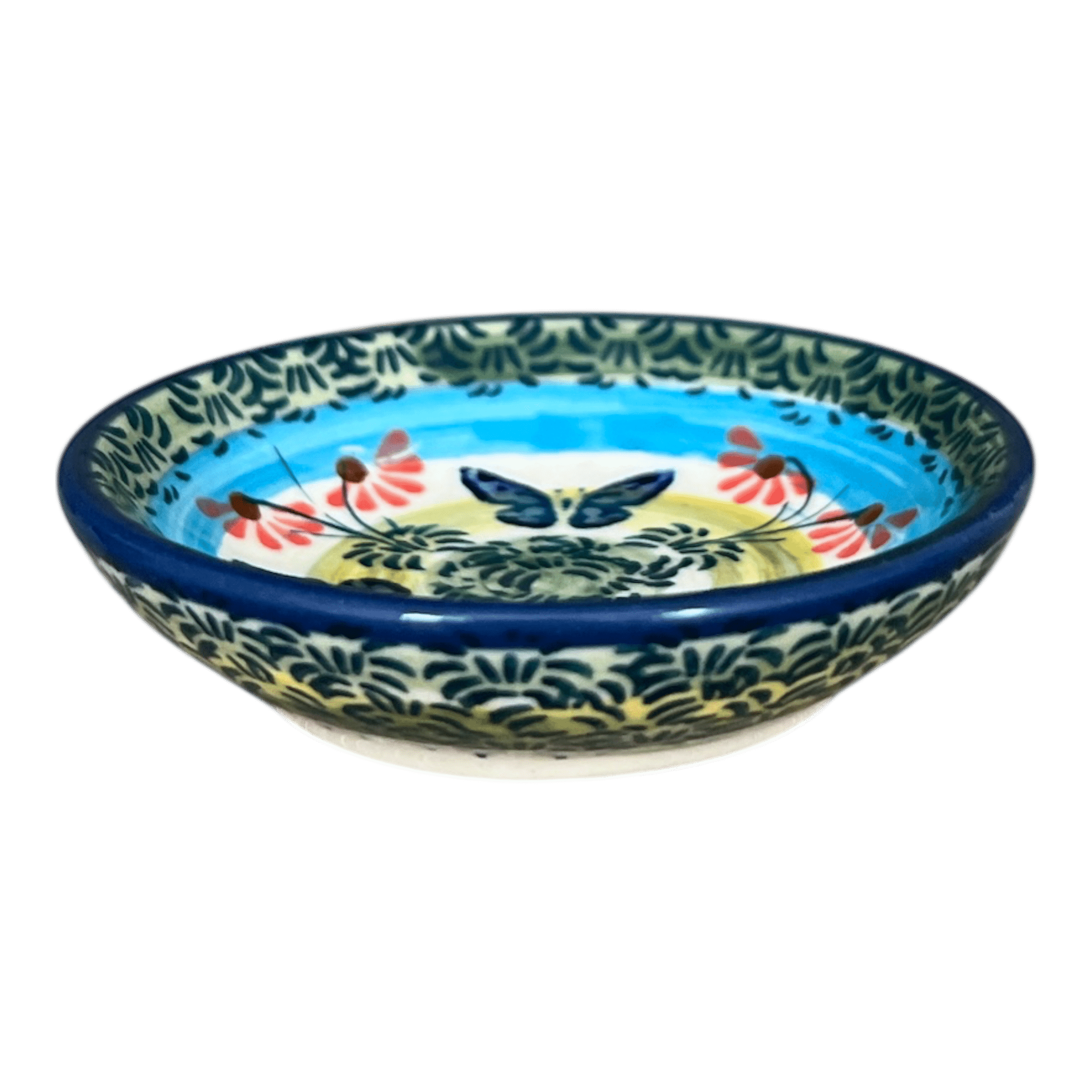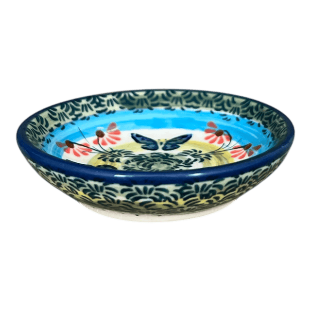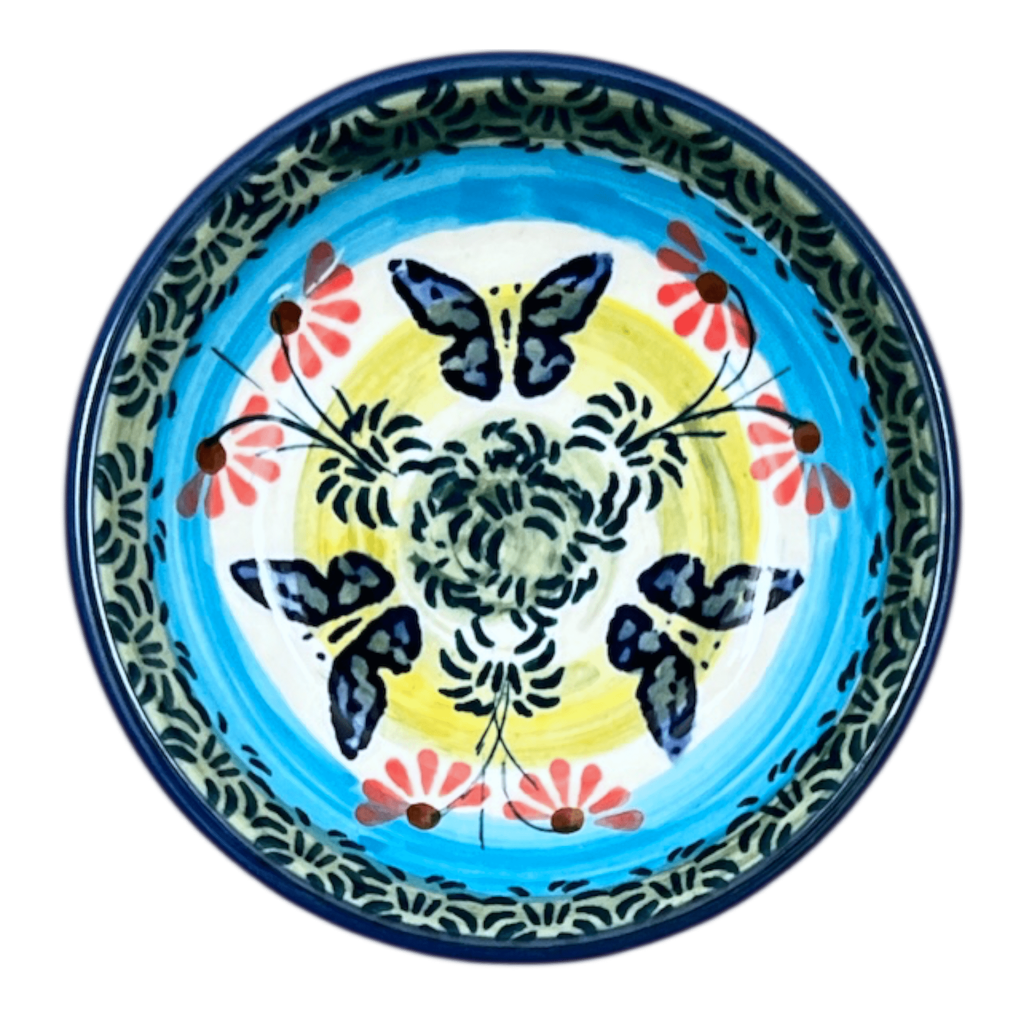 Imagine a splash of vibrant colors and the delicate dance of butterflies right on your table – that's the magic encapsulated in the "Butterflies in Flight" Polish Pottery Bowl by Manufaktura. Crafted in the quaint town of Boleslawiec, Poland, this 3-inch round, shallow bowl is a masterpiece of functionality meets artistry. Whether you're drizzling soy sauce for sushi night or dipping crusty bread into a pool of olive oil and balsamic, this bowl adds a touch of whimsy and color to your culinary experiences. Beyond the dining table, it transforms into a charming keeper of your little essentials – from rings and bobby pins in the bathroom to coins and paperclips on your office desk.