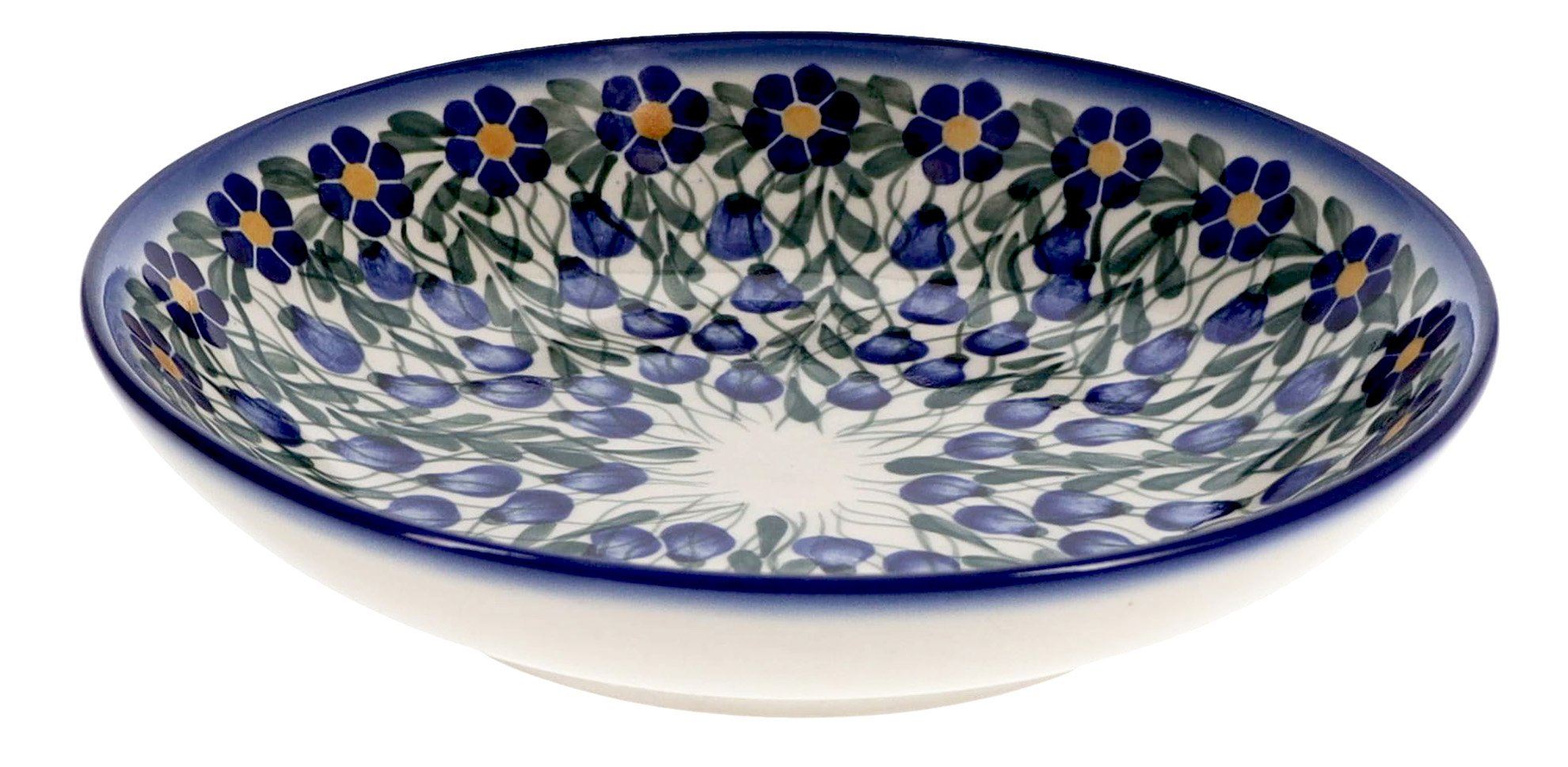 Step into a world where tradition meets modernity with the exquisite "Modern Blue Cascade" Polish Pottery Bowl from W.R. Ceramika. Picture yourself dishing out your favorite fettuccine Alfredo or a crisp Caesar salad in these beautifully crafted round pasta bowls. The shallow design not only makes them ideal for showcasing your culinary creations, but the vibrant pattern of blue flowers and cascading vines against a stark white background brings a burst of color to any meal. Crafted by skilled artisans in Boleslawiec, Poland, each piece carries the echo of centuries-old ceramic artistry, making every meal an elegant affair.