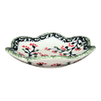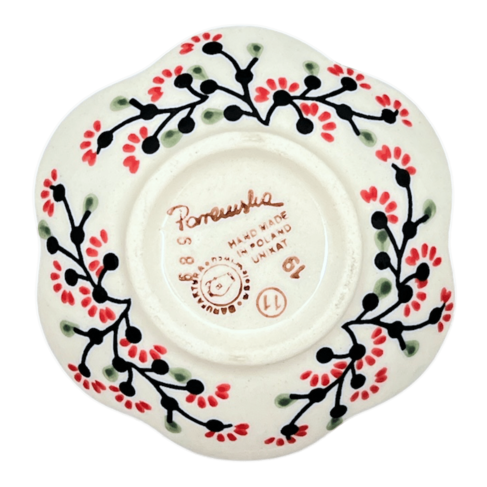Imagine a piece so enchanting that it captures the delicate dance of cherry blossoms against a spring sky—this is the "Cherry Blossoms" scalloped bowl by Manufaktura. Not just a bowl, but a versatile gem at 4.25 inches, perfect for cradling your favorite jewelry, holding a flickering candle, or adding a touch of elegance to your bookshelf. Crafted in the heart of Boleslawiec, Poland, this shallow, scalloped wonder is hand-painted with a flourish of red blossoms, intertwined with black vines on a pristine white background, each stroke telling a story of tradition and artistry.