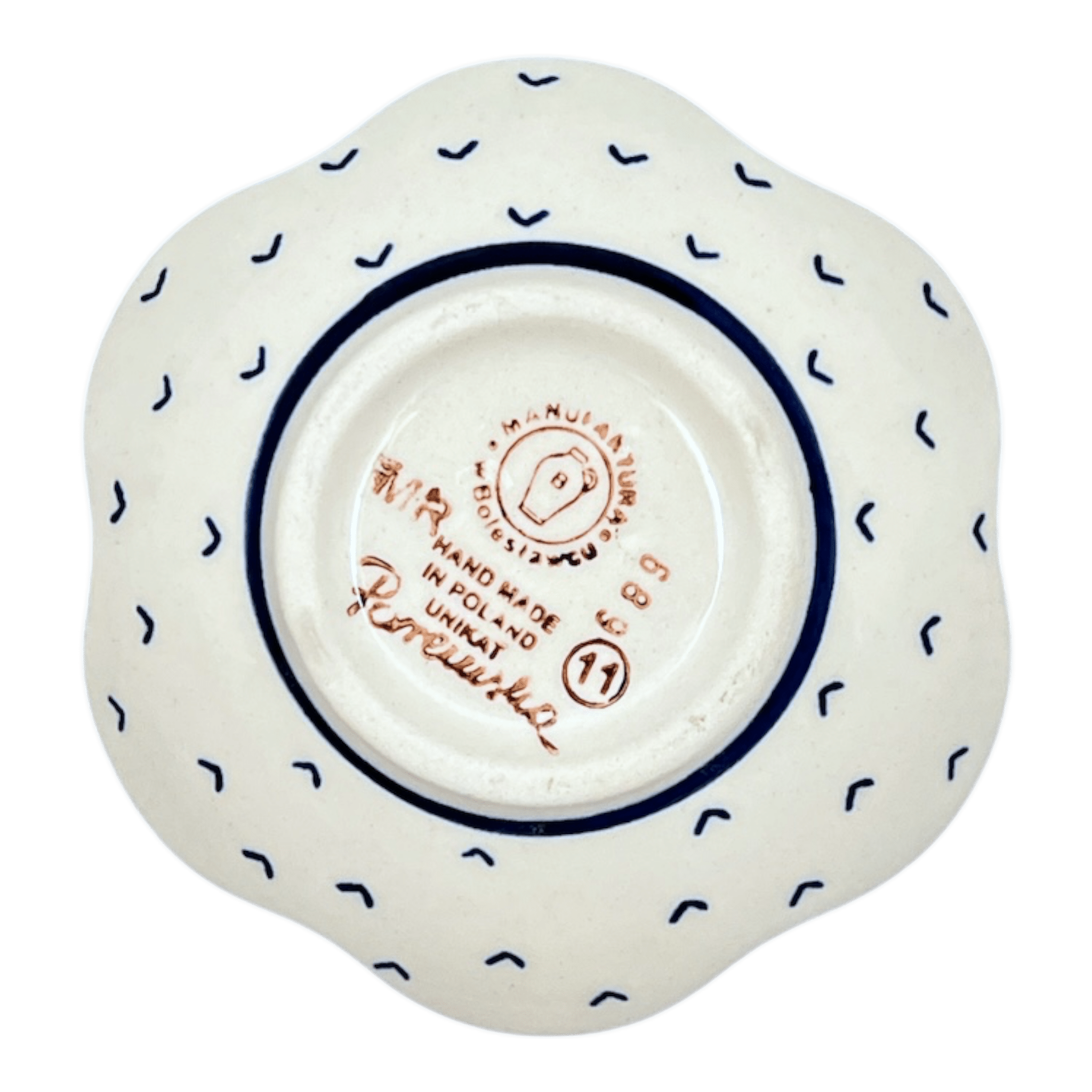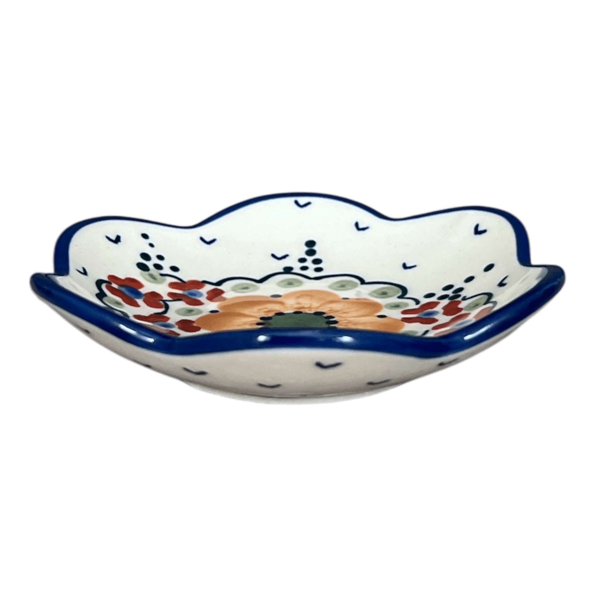 Imagine a piece that captures the essence of autumn and transforms your living space with a splash of artistry—introducing the Polish Pottery Bowl in the enchanting "Autumn Harvest" pattern by Manufaktura. This delightful 4.25" scalloped, shallow bowl isn't just any ordinary dish; it's a versatile gem that doubles as a jewelry holder, an elegant candle holder, or a chic addition to your bookshelf decor. The bowl's design bursts with floral elegance, featuring a mesmerizing dance of predominantly gold flowers with accents of white and green, set against a crisp white background adorned with charming blue circumflexes. It's a scene reminiscent of a serene autumn meadow, bringing a touch of nature's tranquility right into your home.