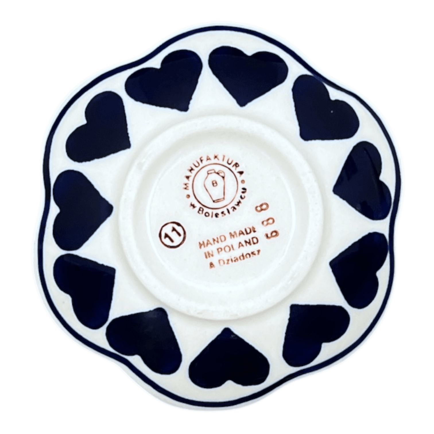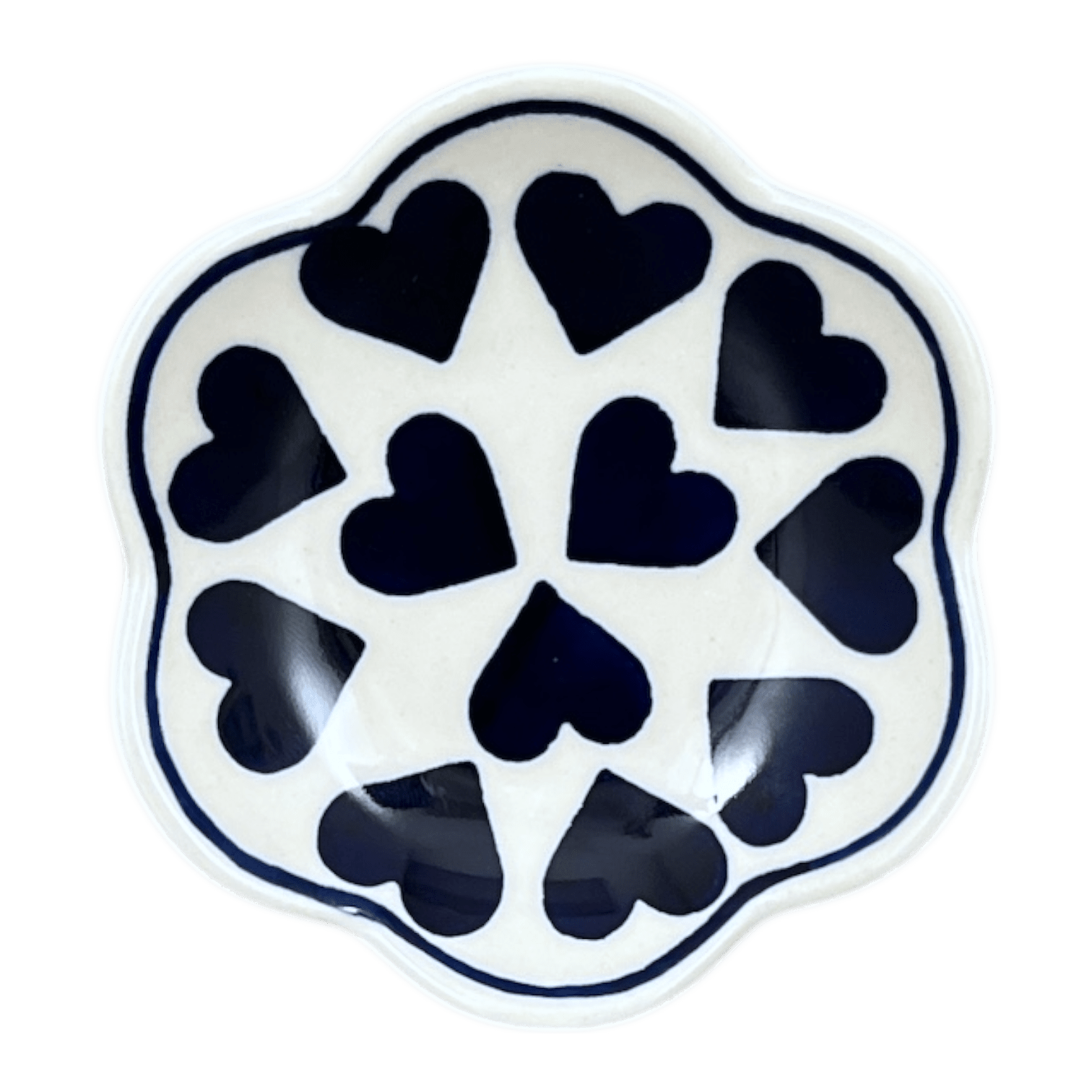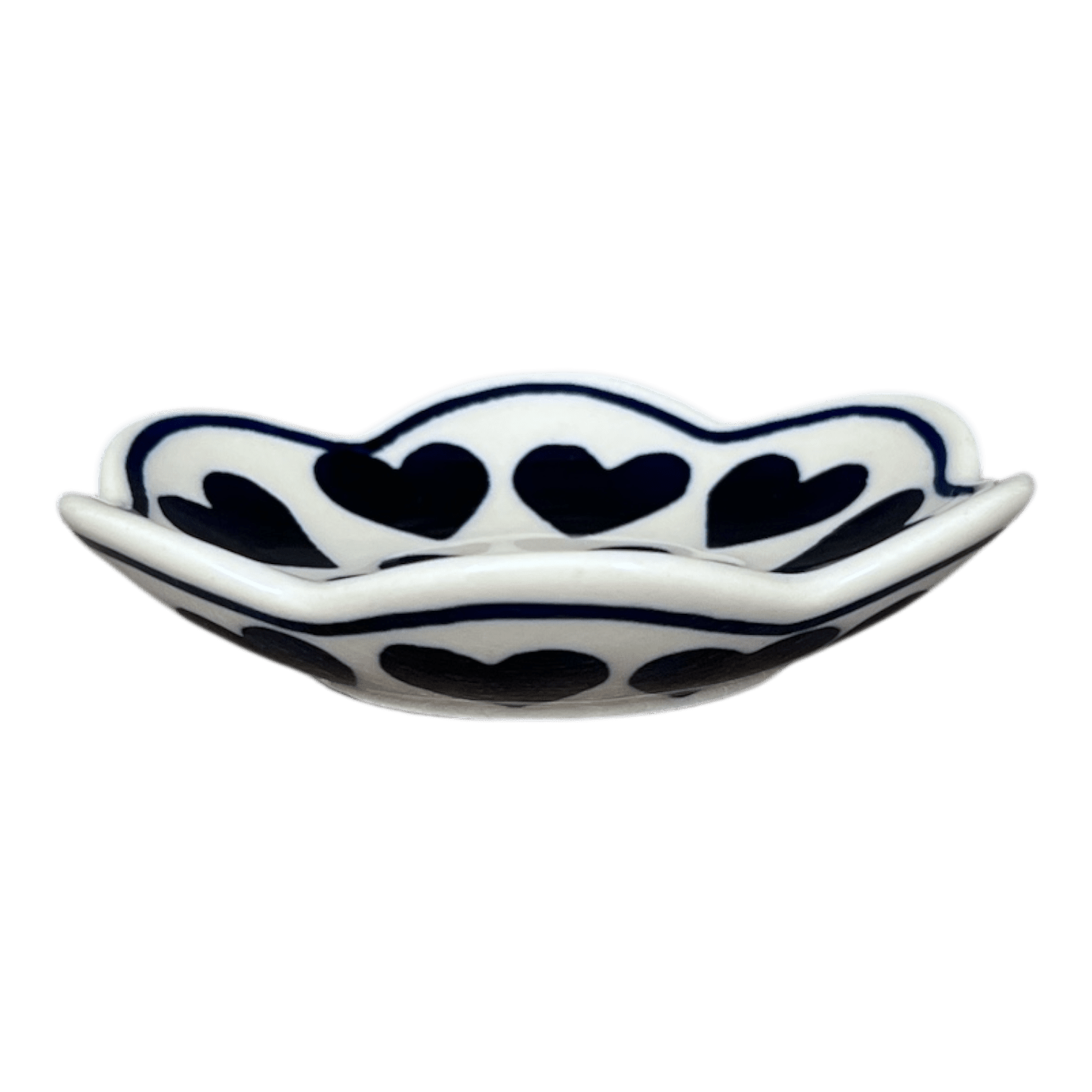 Imagine a dash of enchantment on your bookshelf or a whimsical touch to your dinner table with the charming "Whole Hearted" scalloped, shallow bowl from the renowned Manufaktura of Boleslawiec, Poland. This petite 4.25" masterpiece is not just a bowl, but a versatile treasure that can serve as a quaint jewelry dish, an elegant candle holder, or simply as a delightful piece of decor. Hand-painted in a heartwarming pattern of blue hearts against a crisp white background, each bowl carries the traditional beauty of Polish pottery that's been celebrated worldwide.