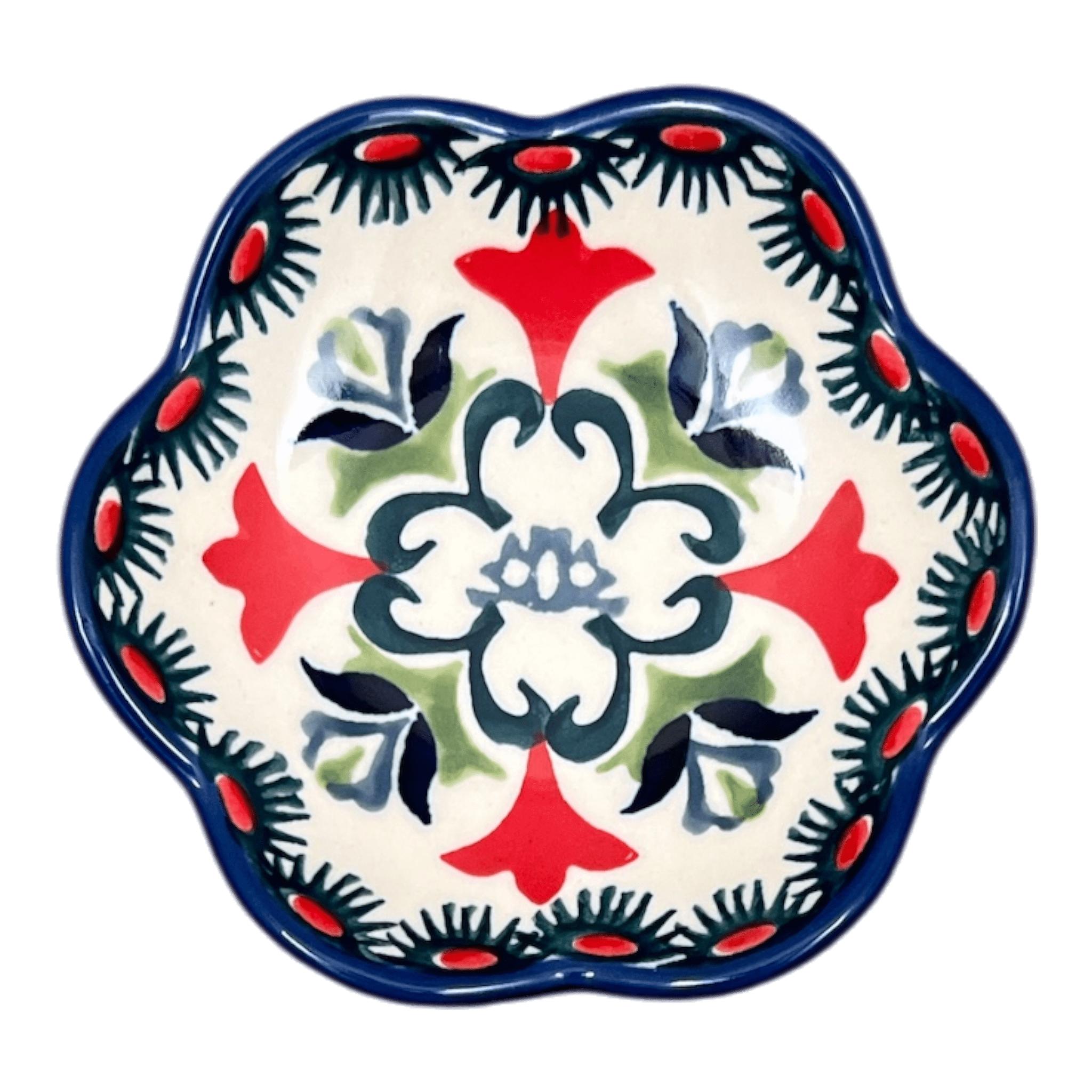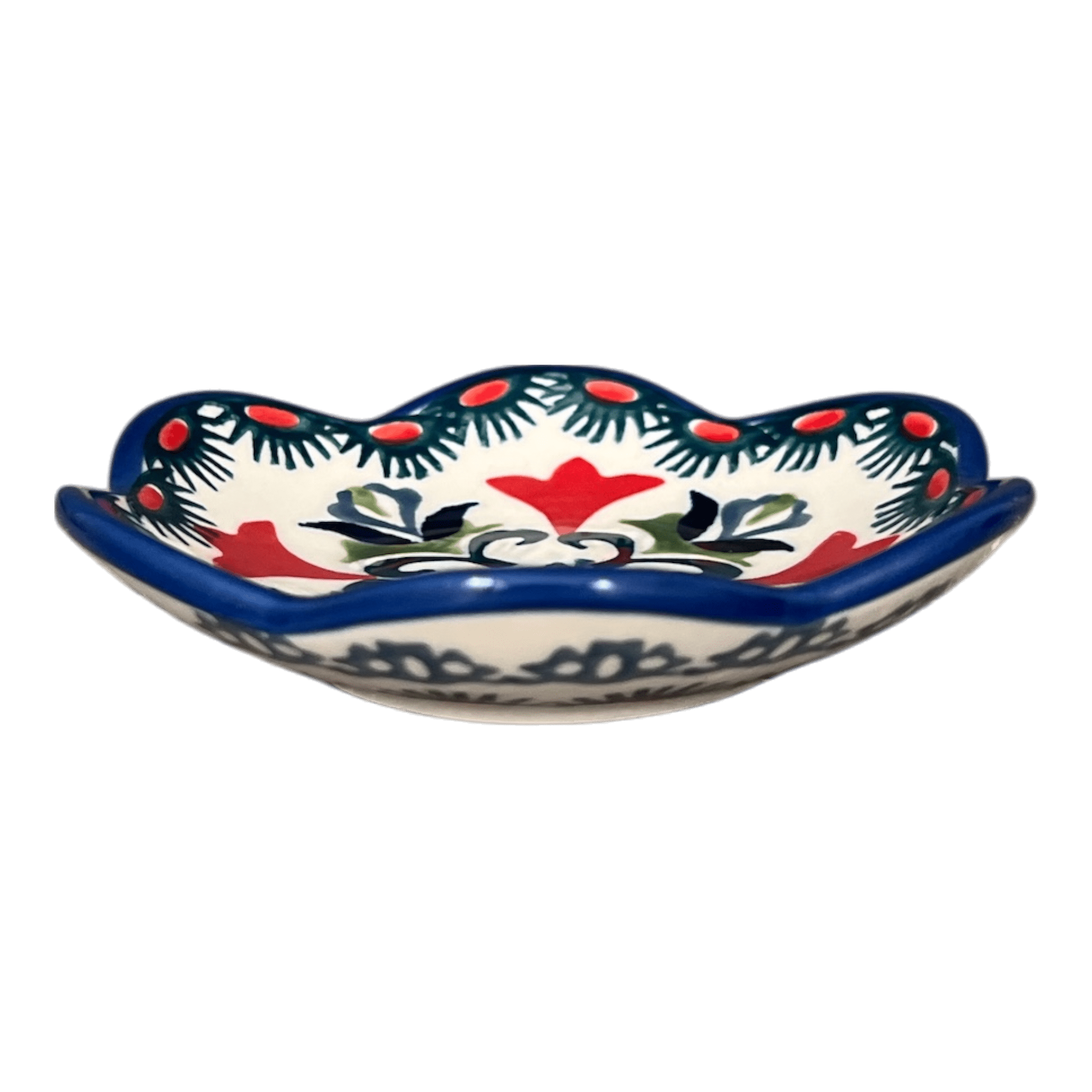Step into a world where tradition meets contemporary charm with the exquisite Polish Pottery Bowl from Manufaktura, showcased in the vibrant "Scandinavian Scarlet" pattern. This delightful 4.25" scalloped, shallow bowl is more than just a dish; it's a versatile gem that can grace your home as a jewelry holder, a chic candle holder, or simply as an eye-catching piece of bookshelf decor. Crafted in the heart of Boleslawiec, Poland, this piece reflects a mastery of craft passed down through generations of skilled artisans. The enchanting design features a crisp white background intercepted by a sophisticated blue geometric weave at the center, encircled by alternating bright red bellflowers and lush teal blossoms—a true testament to the beauty of hand-painted artistry.