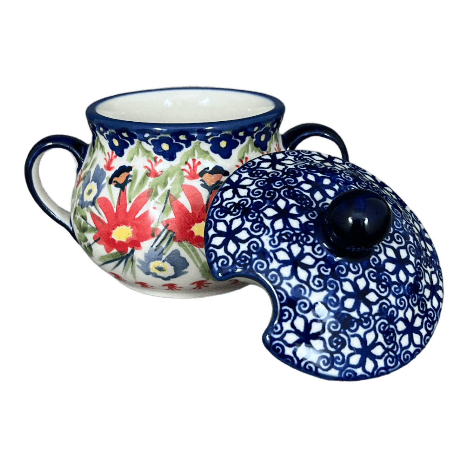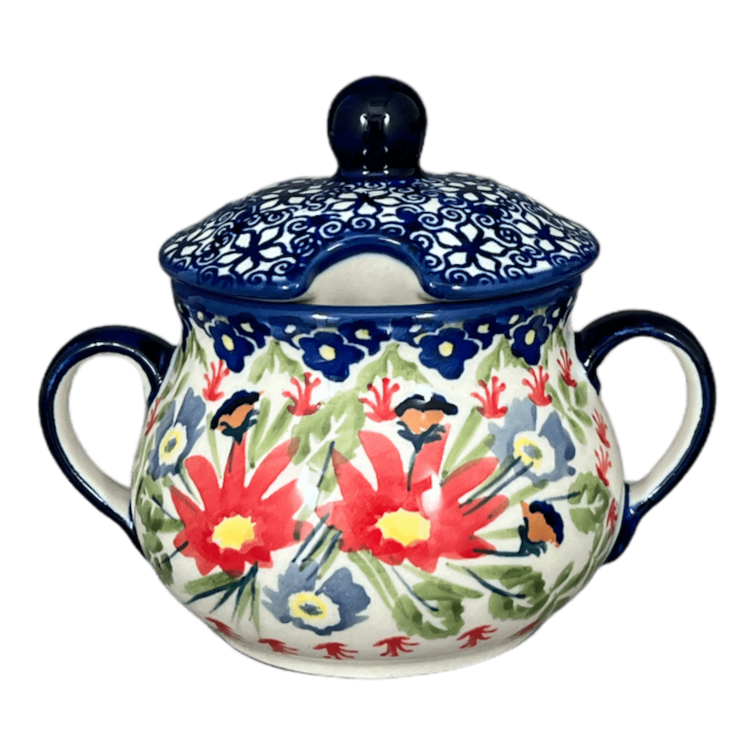 Imagine a splash of vibrant colors and intricate designs adorning your kitchen table – that's the magic woven by the Manufaktura Polish Pottery Sugar Bowl. Nestled in the captivating "Floral Fantasy" pattern, this round sugar bowl is a masterpiece that blends functionality with sheer beauty. Each bowl, measuring a quaint 3.5 inches, is meticulously hand-painted in Boleslawiec, Poland, by skilled artisans who ensure that every swirl of blue and every petal in red bursts with life. The predominantly red flowers, accentuated with hints of blue, green, and yellow, dance around a serene white background, turning an everyday item into a stunning work of art.