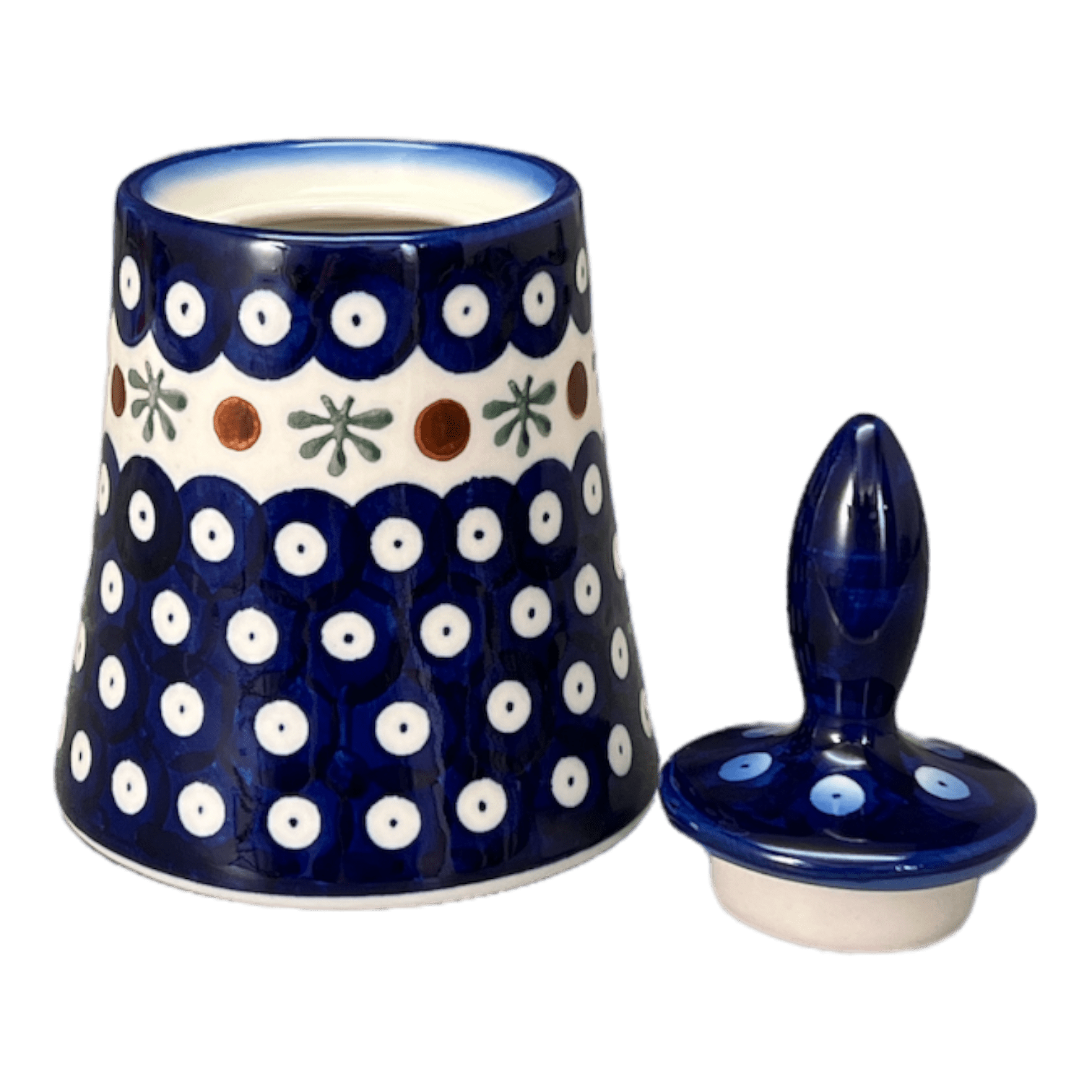 Imagine starting your morning with a spoonful of sweetness from a delightful piece of art! Introducing the charming Polish Pottery Sugar Bowl from W.R. Ceramika, crafted in the enchanting "Mosquito" pattern. This exquisite bowl is more than just a container; it's a small treasure hand-painted with love and care in Boleslawiec, Poland. Standing at 5.5" tall, with a playful design of white polka dots set against a vibrant cobalt blue backdrop, and whimsical green "mosquitoes" darting around, it's sure to bring a smile to your face with every use. The traditional touches of brown dots add a unique twist, making each piece a distinct work of art.