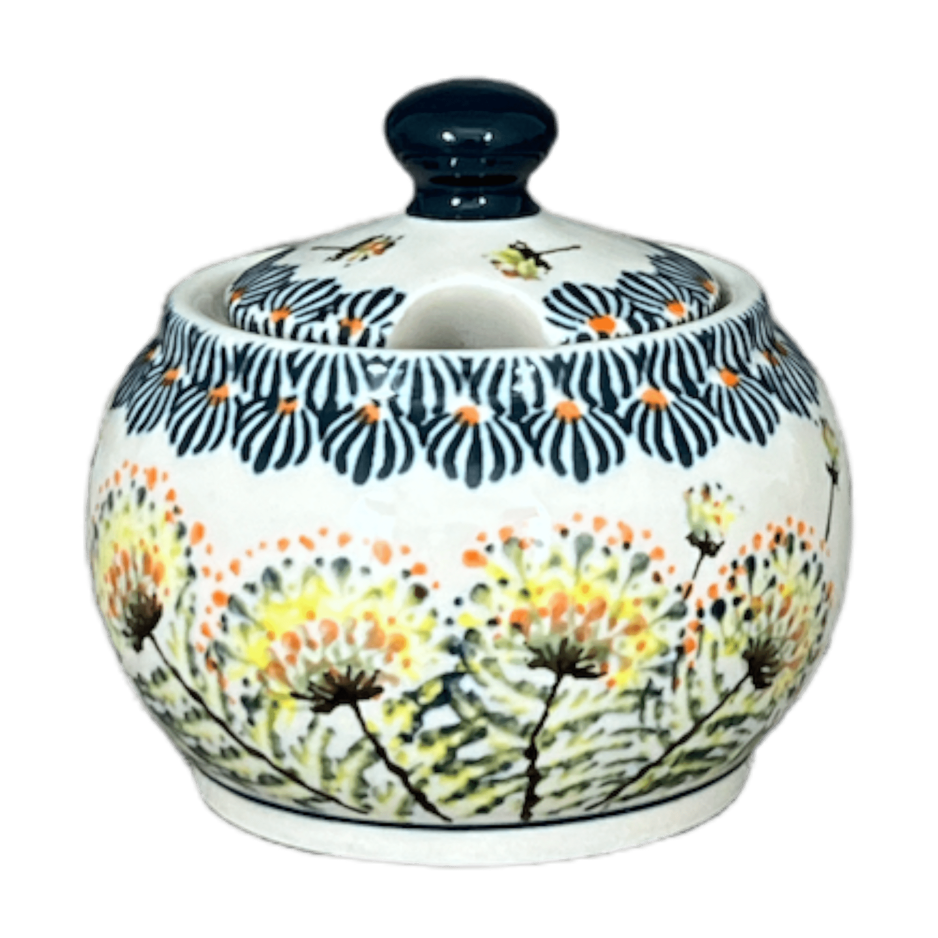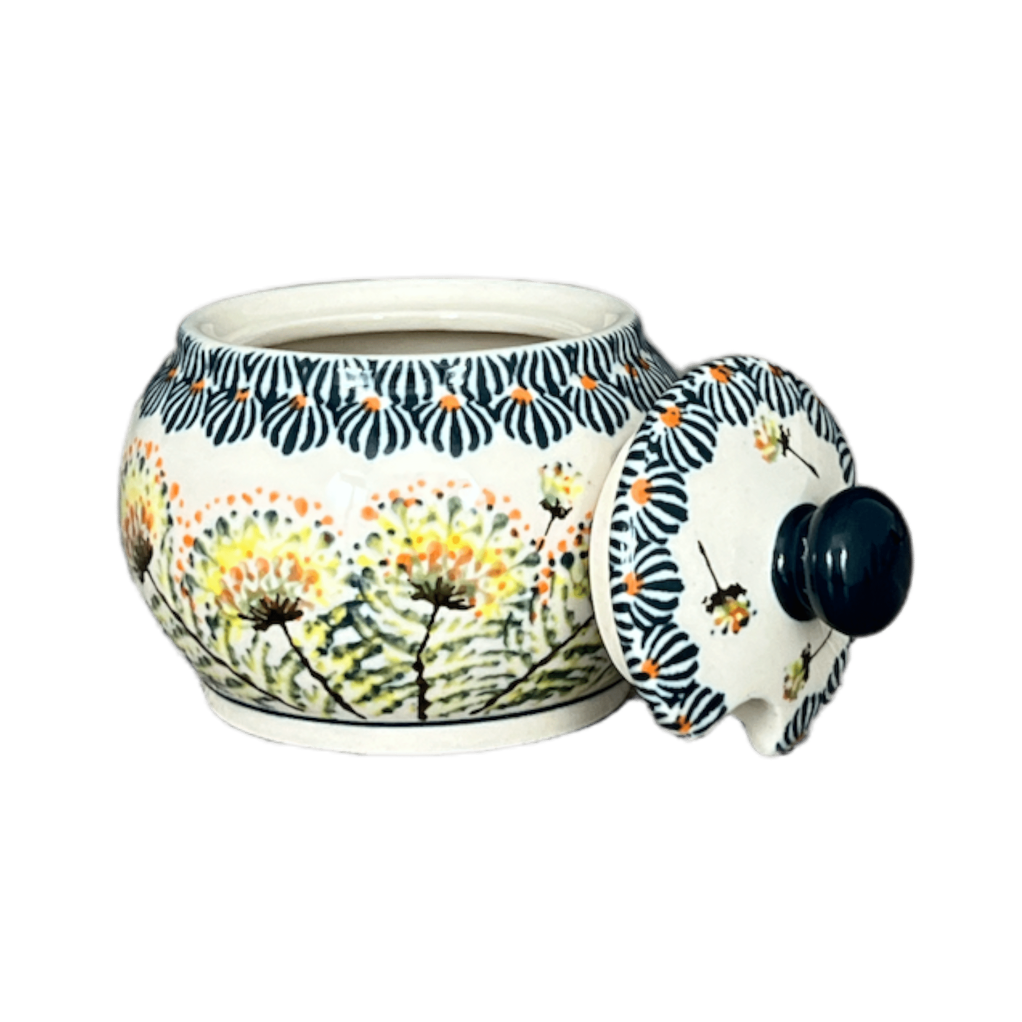 Imagine a burst of sunshine on your breakfast table every morning! That's exactly what the "Dandelions" pattern sugar bowl from Zaklady brings into your home. Adorned with vibrant yellow, green, and orange dandelions stretching skyward on slender green stems, this delightful piece captures the whimsical charm of a meadow in bloom. Floating dandelion tufts dance across a crisp white background, bordered in harmonious green and orange, turning this sugar bowl into a miniature canvas of pastoral art. Each bowl is a small masterpiece, meticulously hand-painted by the celebrated artisans of Boleslawiec, Poland.