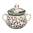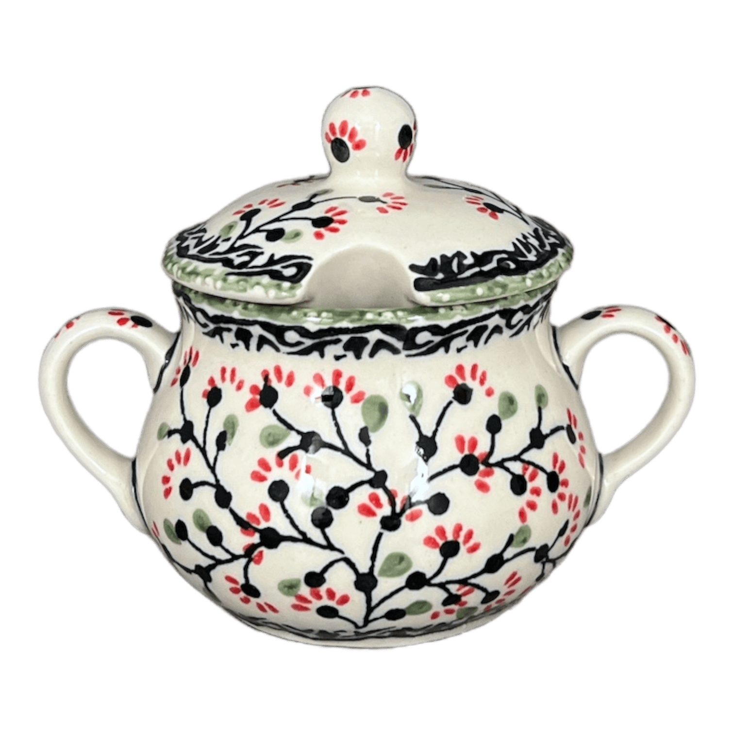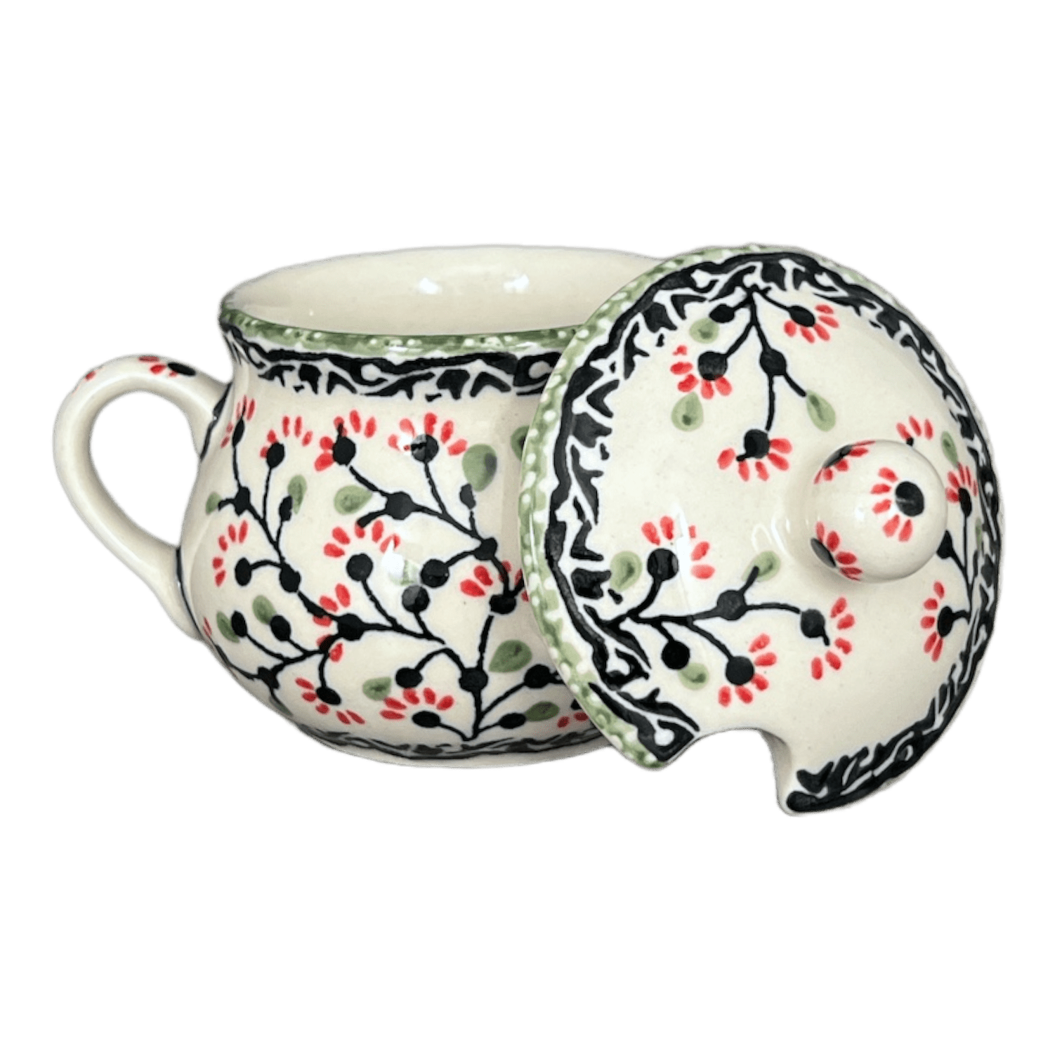 Imagine a touch of enchantment on your dining table, encapsulated perfectly within the Manufaktura Polish Pottery Sugar Bowl. Crafted in the heart of Boleslawiec, Poland, this exquisite piece marries functionality with a burst of artistic flair. The "Cherry Blossoms" pattern, designed by top-tier artisans, dances across the surface with vibrant red blossoms intertwined with delicate black vines, all set against a crisp white background. A playful green dotted rim adds a final touch of whimsy, ensuring this bowl is not just a container, but a centerpiece that captivates and charms all who gaze upon it.