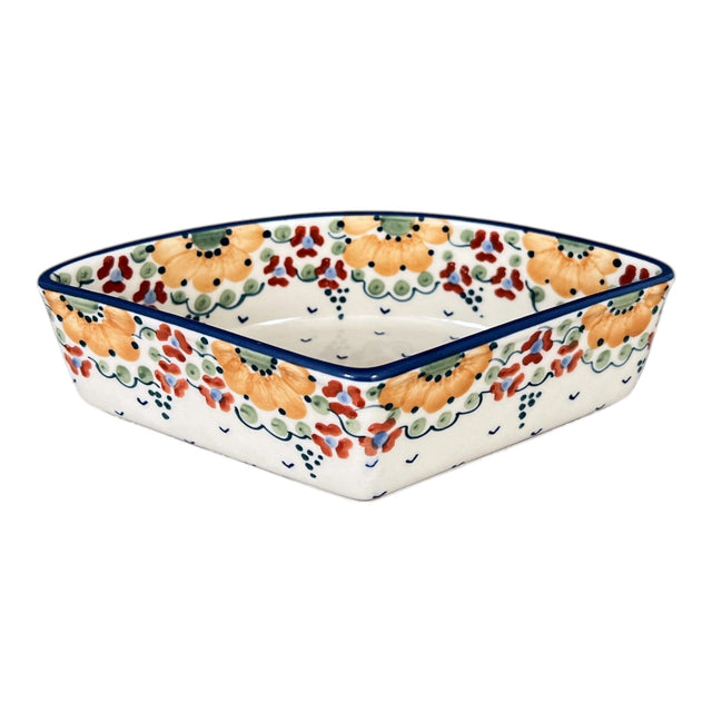 Imagine a piece of pottery that isn't just a bowl, but a canvas of vibrant autumnal art! The Polish Pottery Wedge-Shaped Bowl from Manufaktura, in the breathtaking "Autumn Harvest" pattern, is exactly that. This 5" x 8.5" marvel transforms any setting with its rich tapestry of gold, accented with white and green, enveloping detailed floral designs that dance around the piece. Whether you're dishing out snacks, dips, or delectable candies, these bowls bring a splash of color and a touch of elegance to any culinary arrangement. Their unique wedge shape allows them to be combined into a full circle, perfect for an array of dips during a gathering, or aligned in a row for an artistic display of ice cream sundae toppings or salad extras.