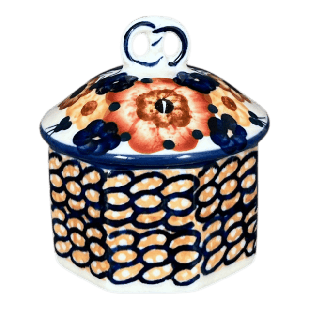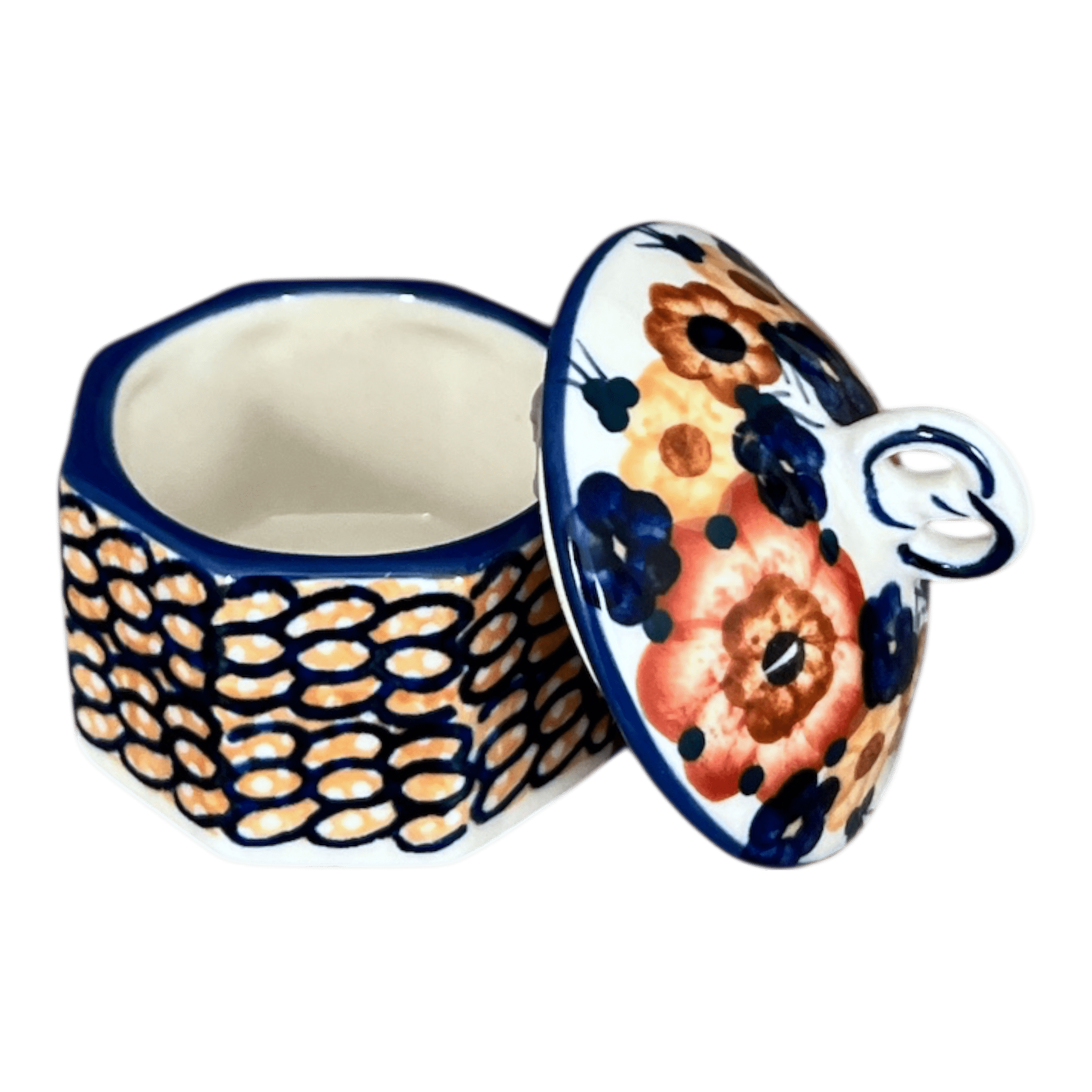 Imagine a tiny treasure trove, artfully crafted and bursting with vibrant colors, ready to add a sprinkle of charm to your everyday life. Enter the world of the Polish Pottery Box, Mini Pretzel, standing petite at 2.75 inches, and handcrafted by the esteemed artisans of Manufaktura. Whether it's cradling your favorite butter or safeguarding your cherished jewels, this exquisite box, adorned with the delightful "Bouquet in a Basket" pattern, transforms ordinary storage into a visually stunning experience. Picture the predominantly brown backdrop, playfully accented with hues of blue, peach, and white, bringing a warm, inviting glow to any corner of your home.