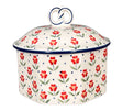Introducing the enchanting Large Pretzel Polish Pottery Box from Manufaktura, a masterpiece that combines practicality with an artistic flair. Measuring a perfect 7 inches all around, this delightful box is not just a storage solution but a piece of art to adorn your kitchen counter or organize your bathroom essentials. Crafted in the heart of Boleslawiec, Poland, this box features the "Simply Beautiful" pattern, which is a traditional display of small, simple red flowers connected by very thin stems and accented with tiny green leaves and playful blue dots, adding a touch of whimsy to its charming design.