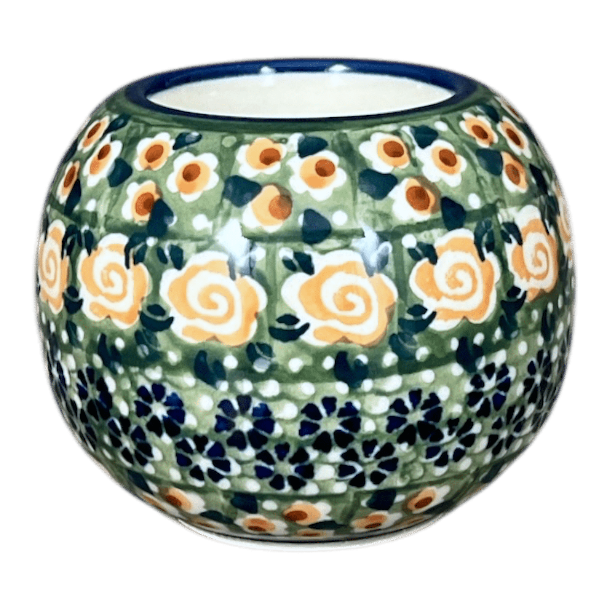 Imagine a touch of timeless elegance and a splash of vibrant charm lighting up your home, with the Manufaktura Polish Pottery Candle Holder. Crafted in the heart of Boleslawiec, Poland, this exquisite ball-shaped candle holder stands at a quaint 2.5 inches tall but makes a grand impression. Adorned in the "Perennial Garden" pattern, it features a lush green backdrop intertwined with delicate white and orange flowers, playful orange swirls, and serene blue blossoms encircling the center. This piece isn’t just a candle holder; it's a portal to a world of blooming gardens and serene landscapes, promising to add a warm bit of ambiance to any table or living space.