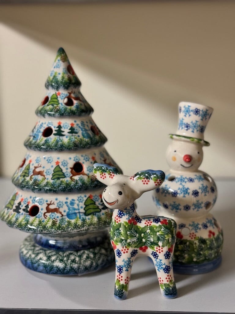 Step into the enchanting world of Polish pottery with the stunning 10" Large Polish Pottery Luminary in the whimsical "Reindeer Dance" pattern by Galia. This beautifully crafted Christmas tree luminary is more than just a decoration; it's a gateway to a magical holiday ambiance. Picture this: a chilly winter evening, a cup of hot cocoa in hand, and the gentle glow of this charming luminary lighting up the room with a soft, warm light. The intricate "Reindeer Dance" pattern dances around the luminary, featuring joyful reindeer, playful snowmen, and serene pine trees, all set against a crisp white background speckled with blue snowflakes and framed by a green pine needle border.