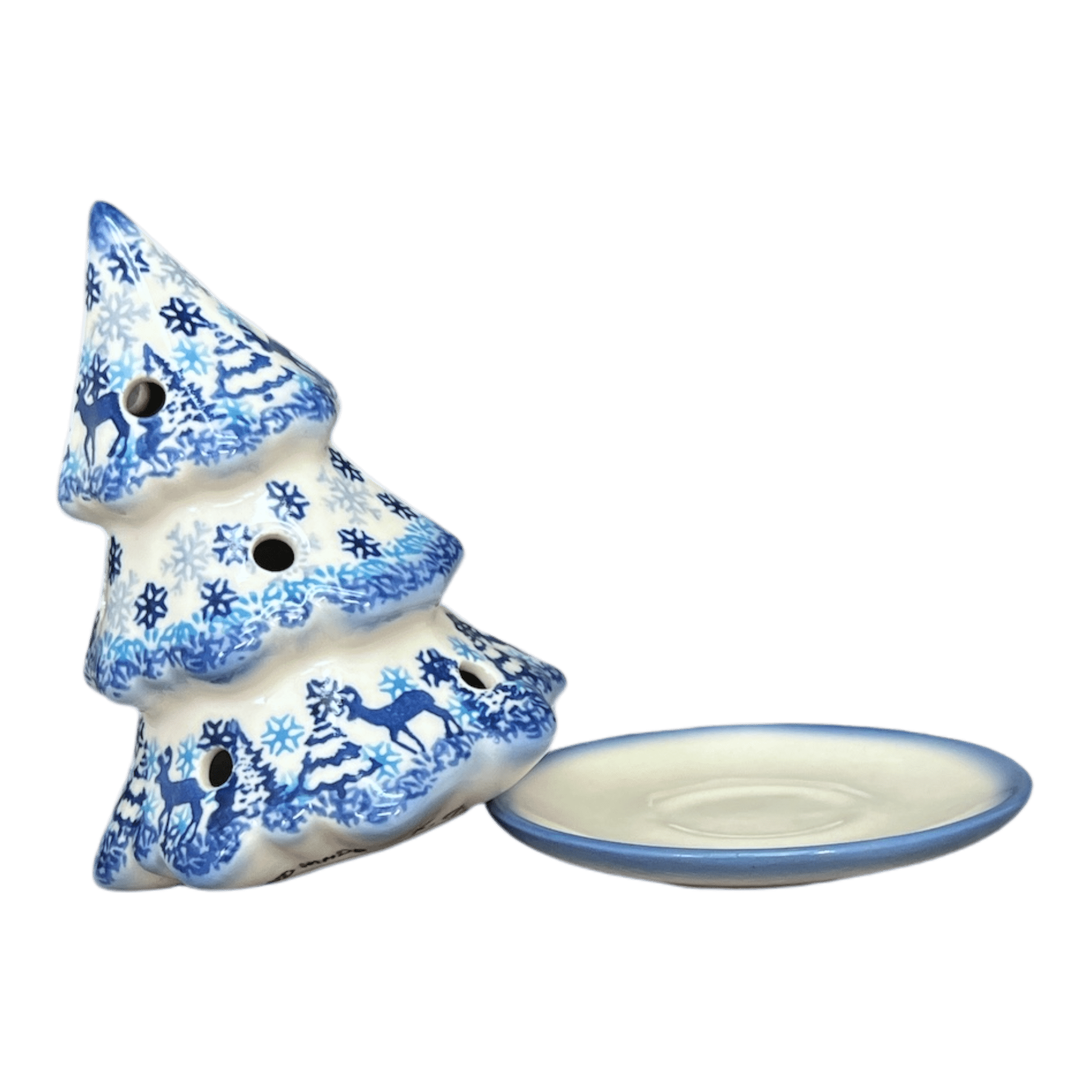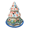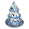 Imagine the enchanting glow of a winter wonderland right in your living room with the Polish Pottery Luminary, Christmas Tree from Galia. This delightful piece stands 5 inches tall, crafted with love and skill in the quaint town of Boleslawiec, Poland. Light up the hand-painted "Snowy Night" pattern, where cobalt blue skies twinkle with light blue snowflakes, and a lively border of Christmas trees and reindeer dances around a dark blue rim. Just slip a tealight (electric or traditional) into the base, crown it with the ceramic tree, and bask in the festive radiance that transforms your space into a cozy, holiday retreat.