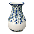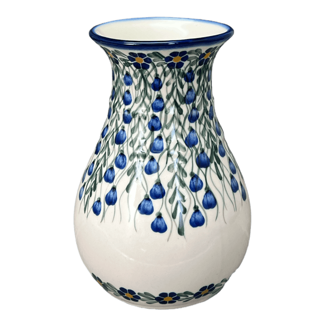 Introducing the mesmerizing "Modern Blue Cascade" Polish Pottery Vase by W.R. Ceramika, a stunning 8.5" tall piece that promises to be as breathtaking as the blossoms it holds. Picture this: a cascade of vibrant blue flowers and delicate green vines, each detail lovingly stamped by hand, dancing playfully against a crisp white backdrop. This traditional Polish pattern, brimming with flowers and natural splendor, reflects a beloved art form renowned worldwide, bringing the charm of Poland's famed ceramics right into your living room.