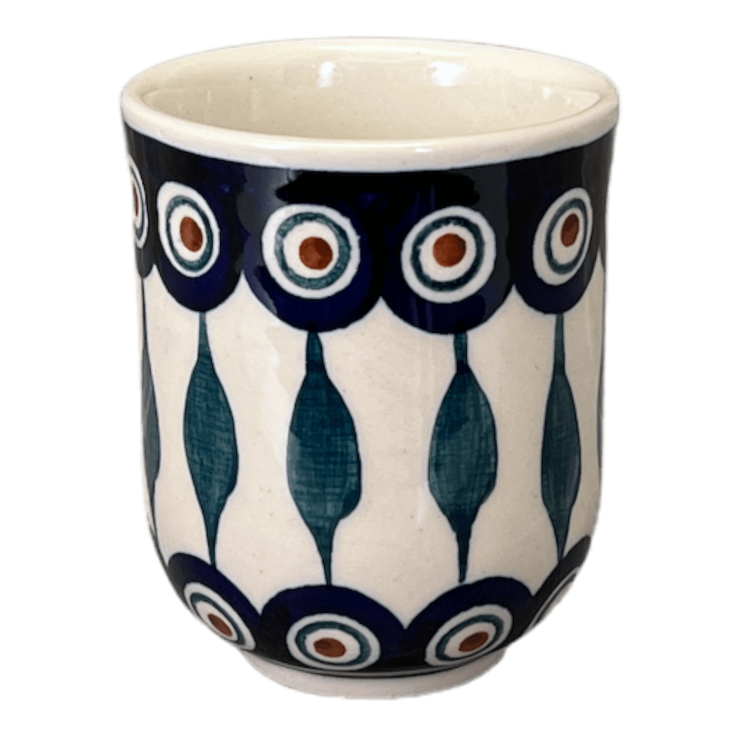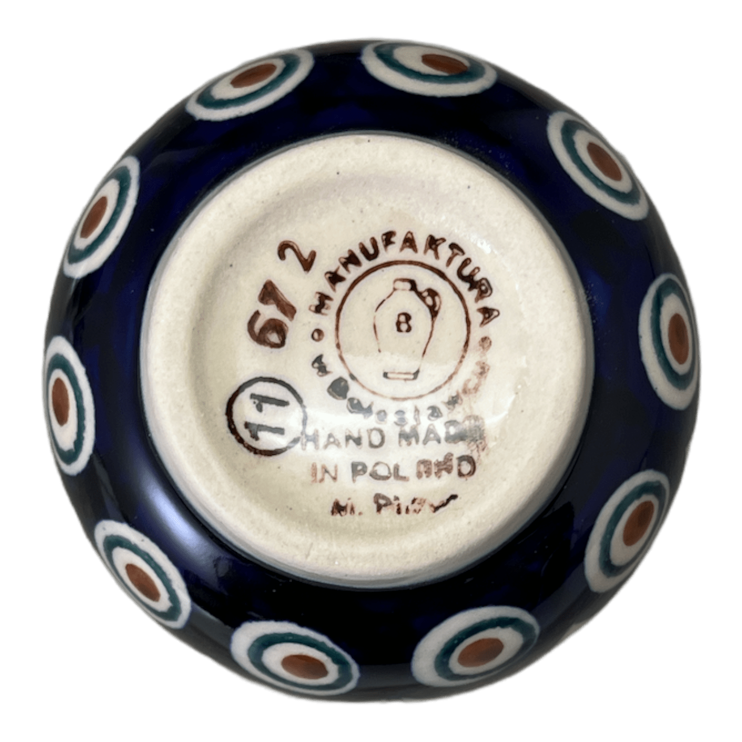 The "Peacock" design itself is a feast for the eyes, featuring a striking array of peacock circles set against a vibrant blue backdrop. Radiant teal green petals sprawl from the center to the edges, resting on a crisp white canvas. This pattern showcases the Traditional level of artistry in Polish pottery, where familiarity breeds beauty. Each piece is a testament to the centuries-old "punching" technique of hand stamping, employed by skilled artists whose inspiration springs from the natural world. Although considered simpler in design, these patterns hold a charm that is endlessly replicated across various makers, ensuring that no two pieces are exactly alike. This variance adds a unique personal touch to each cup, making it not just a household item but a piece of art.