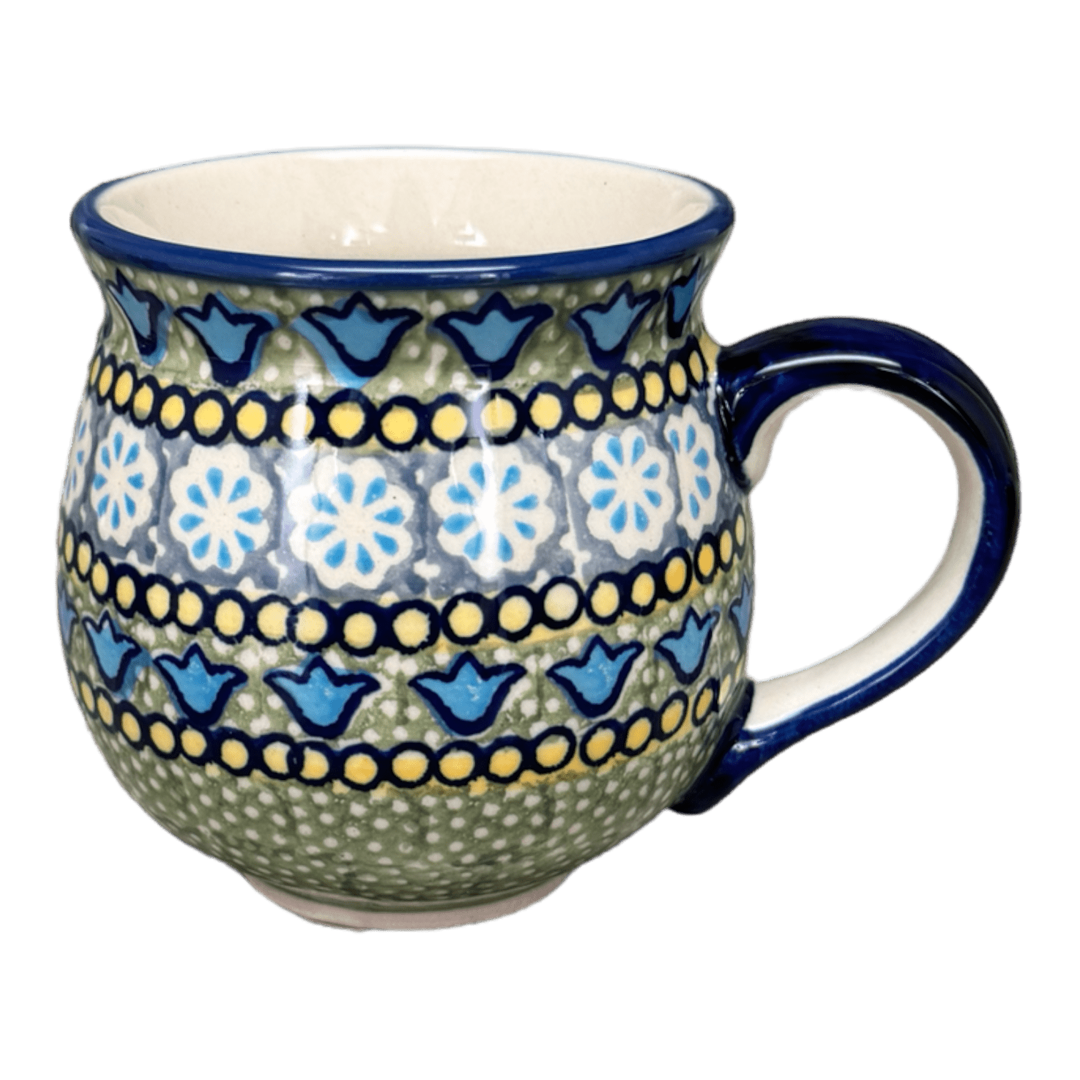 Imagine cradling a masterpiece in your hands each morning as you sip your first cup of coffee. The 10 oz. Medium Belly Mug from Manufaktura isn't just a coffee cup; it's a portal to an artistic tradition that dates back centuries. Handcrafted in the heart of Boleslawiec, Poland, this mug is painted in the enchanting "Blue Bells" pattern, featuring a mesmerizing dance of geometric shapes and vibrant colors. Light blue bellflowers and yellow accents pop against a lush green backdrop, making every coffee break feel like a stroll through a blooming European garden.