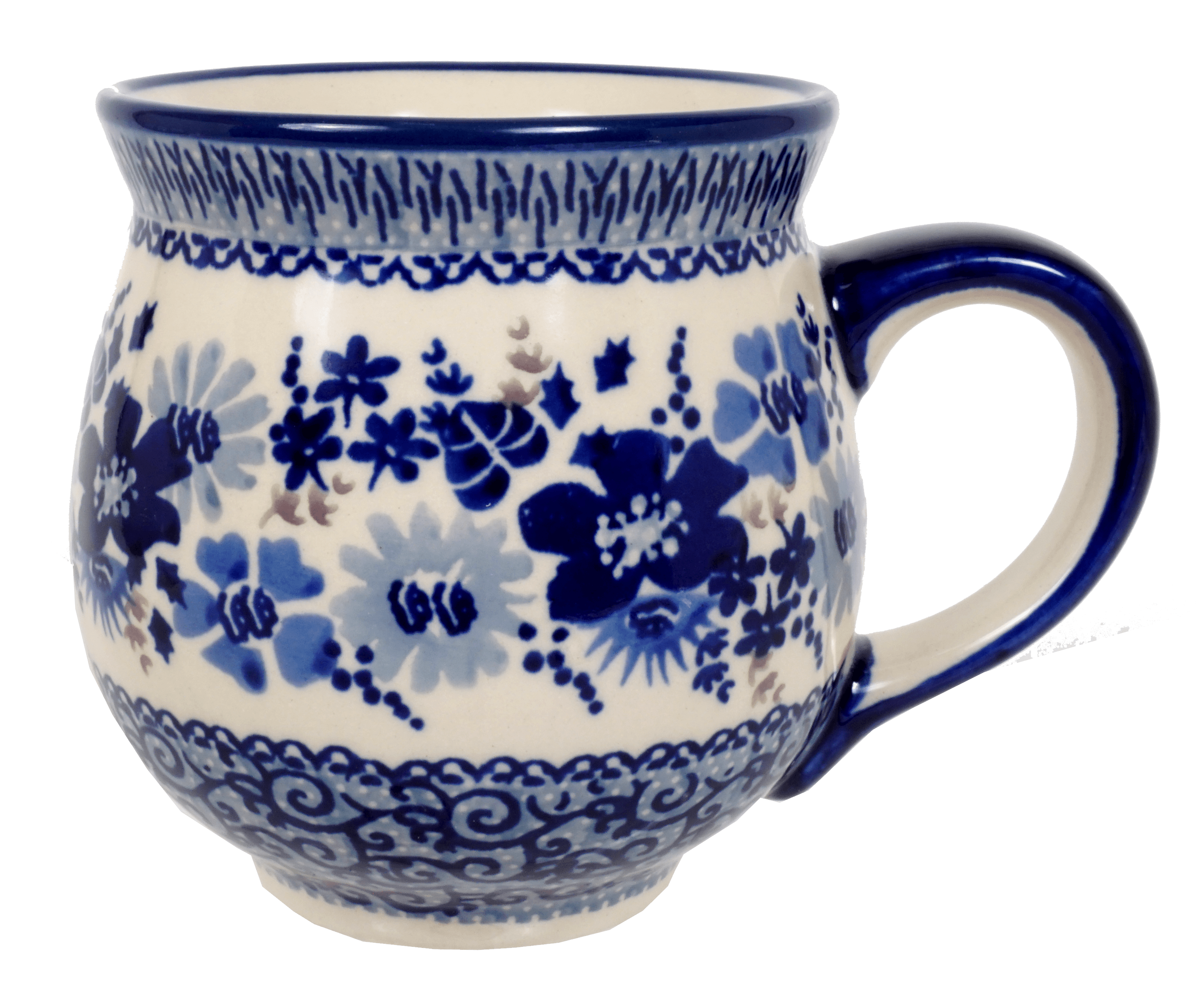Introducing the Polish Pottery 16 oz. Large Belly Mug by Manufaktura in the mesmerizing "Blue Life" pattern (EO39). These mugs are not just your ordinary mugs; they combine ample volume with exquisite design. Imagine starting your morning with a steaming cup of coffee or tea, perfectly fitting in your hand. These mugs are not only microwavable but also spill resistant, ensuring that you have a worry-free start to your day.
