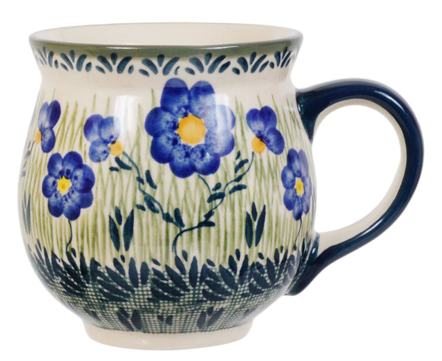 Imagine sipping your morning coffee or tea from a masterpiece of color and craftsmanship. Introducing the 16 oz. Large Belly Mug by Manufaktura, adorned in the exquisite "Bold Blue Blossoms" pattern. This isn't just any mug; it's a canvas where dark blue hues dance with lively green and golden accents, all set against a pristine white background. The center features a ring of teal green leaves, surrounded by large, detailed flowers and tall grass that seem to sway with an unseen breeze. This mug doesn’t just hold your drink; it holds a story of artistic tradition.