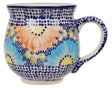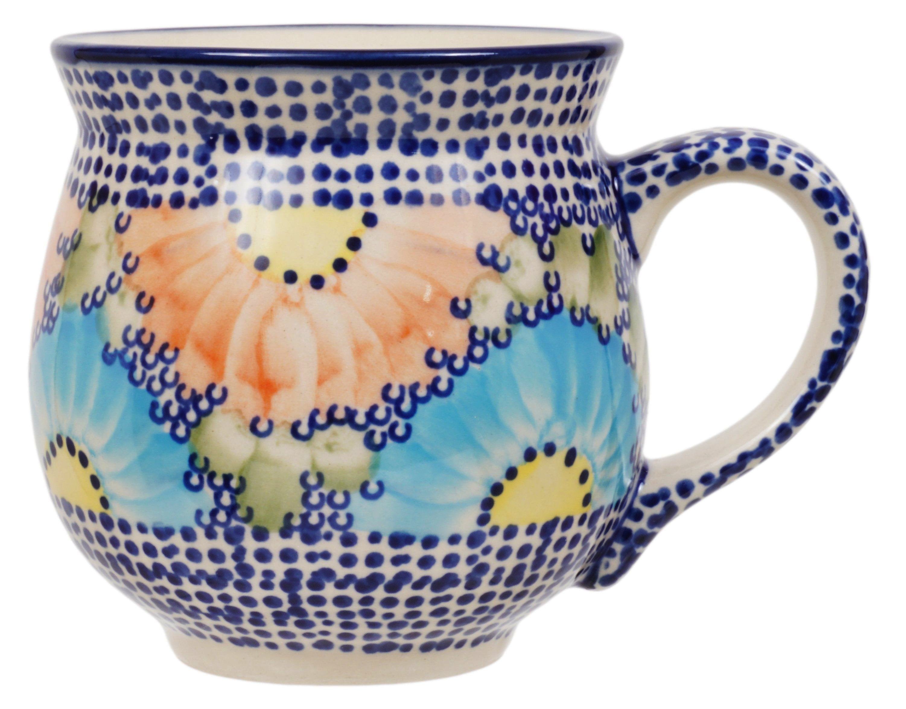Imagine beginning your day with a burst of artistry and color, cradling a masterpiece in your hands. The Manufaktura 16 oz Large Belly Mug is not just any mug—it's a canvas showcasing the vibrant "Fiesta" pattern. Expertly crafted in the heart of Boleslawiec, Poland, this mug is a testament to the rich tradition of Polish pottery. Each mug is hand-painted by skilled artisans, making your morning coffee an intimate encounter with art. The "Fiesta" pattern blooms with large, detailed flowers in shades of light blue and orange, set against a backdrop of green leaves and tiny blue circles, creating a lively and joyful start to your day.