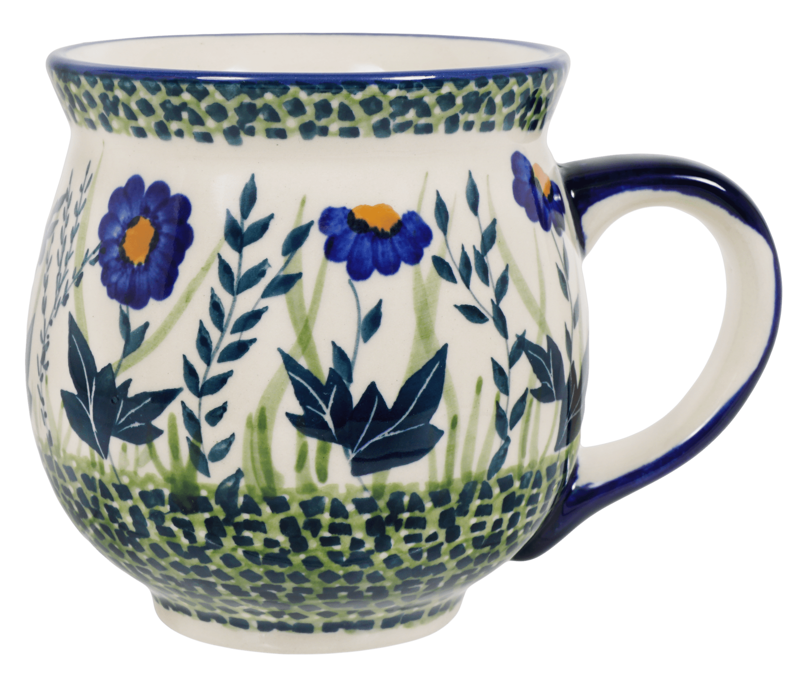 Upgrade your morning routine with the Polish Pottery 16 oz. Large Belly Mug in the captivating "Bouncing Blue Blossoms" pattern. With its combination of beauty, functionality, and safety, this mug is truly a gem that will bring joy and color to your home. Get yours today and start your day off right!