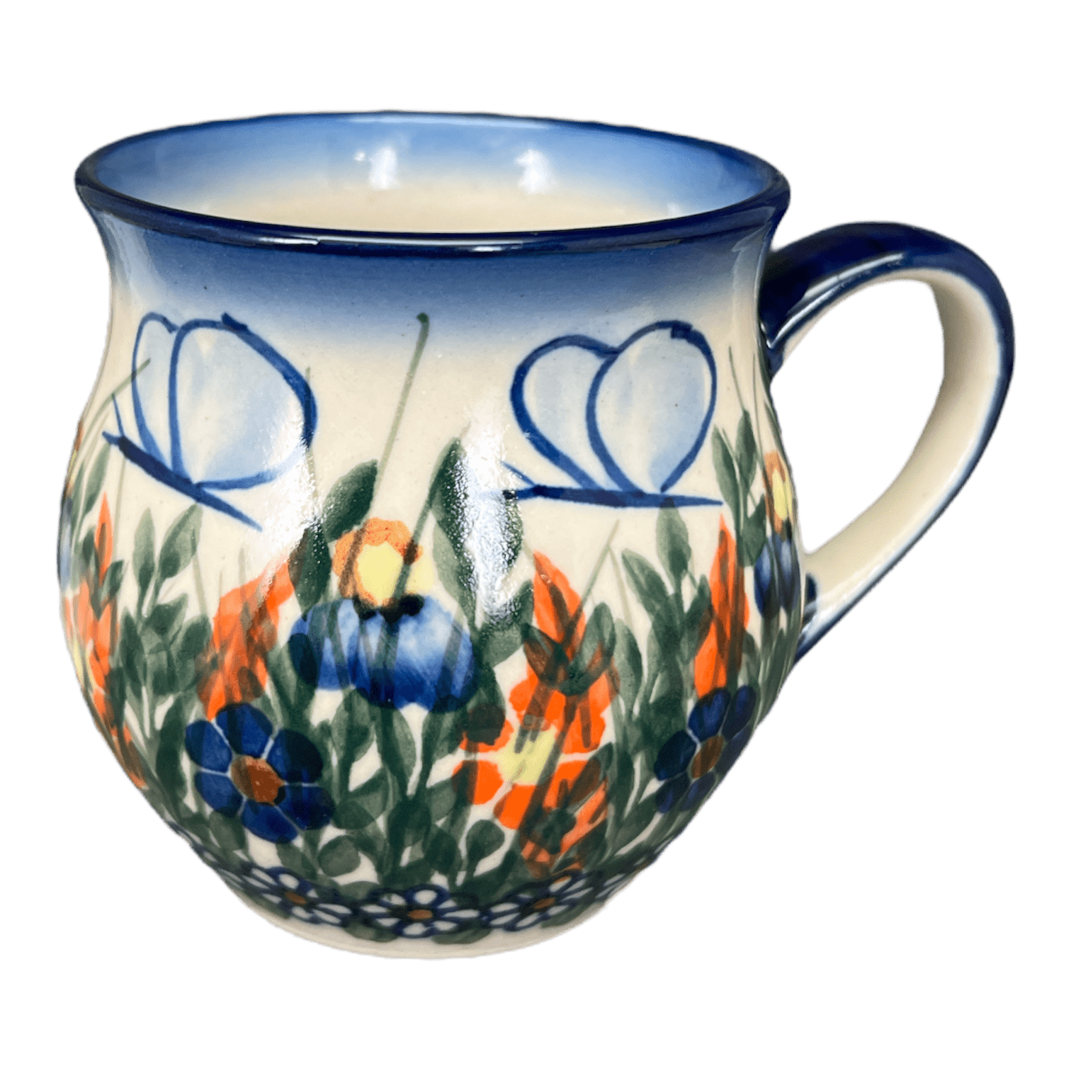 Introducing the Polish Pottery 8 oz. Small Belly Mug by W.R. Ceramika in the captivating "Butterfly Delight" pattern (PP2). Imagine starting your day with a steaming cup of coffee or tea, nestled in a stunning, handmade, hand-painted Polish pottery mug. This mug features the enchanting "Butterfly Delight" pattern, where design elements gracefully blend flowers and butterflies in a mesmerizing array of colors - predominantly blue, with delightful accents of green, orange, and white.