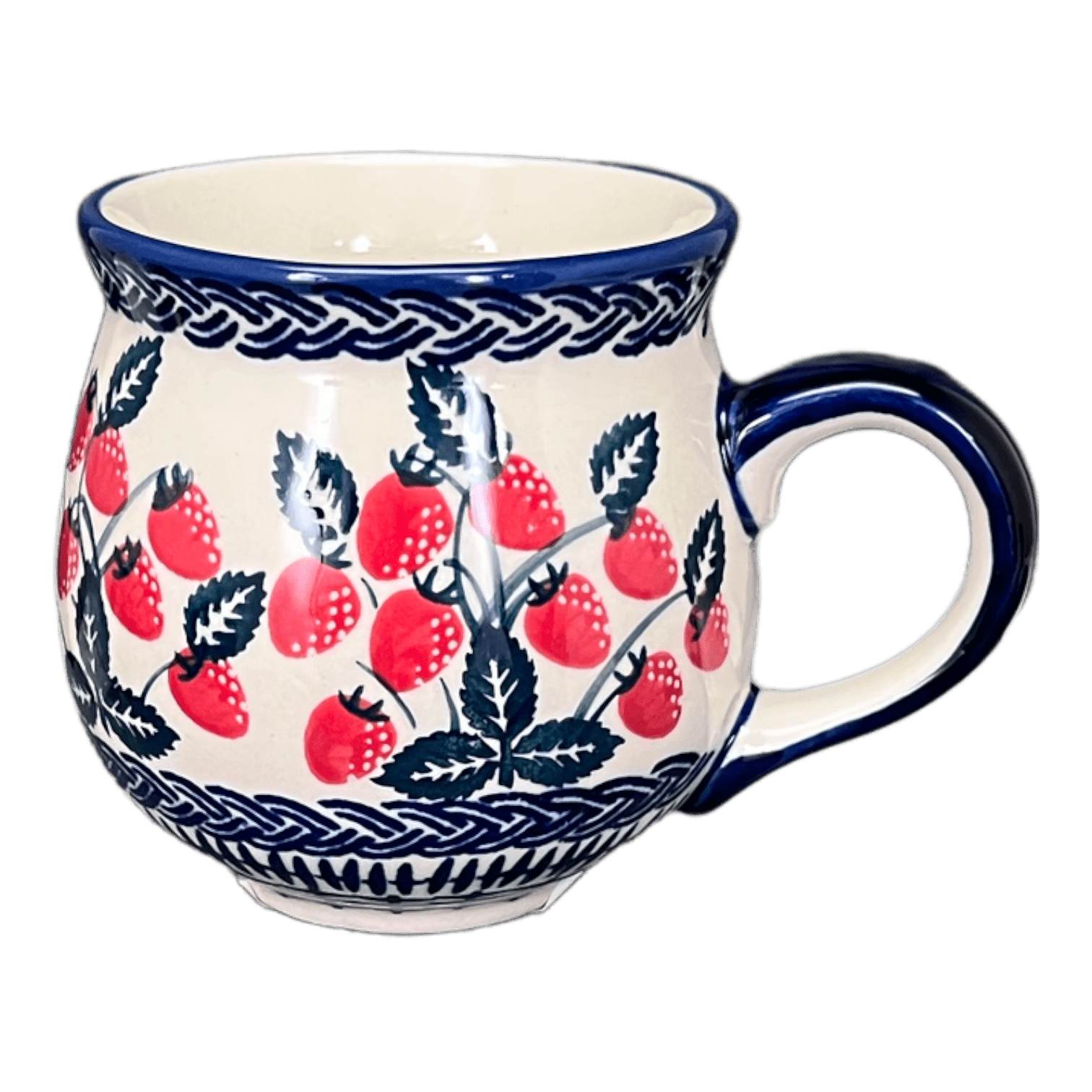 Introducing the Polish Pottery 10 oz. Mug by Manufaktura in the delightful "Fresh Strawberries" pattern (AS70). This medium belly mug is not your ordinary coffee cup. With its perfectly shaped design and exquisite Polish pottery craftsmanship, it's the ultimate way to start your day on a high note!