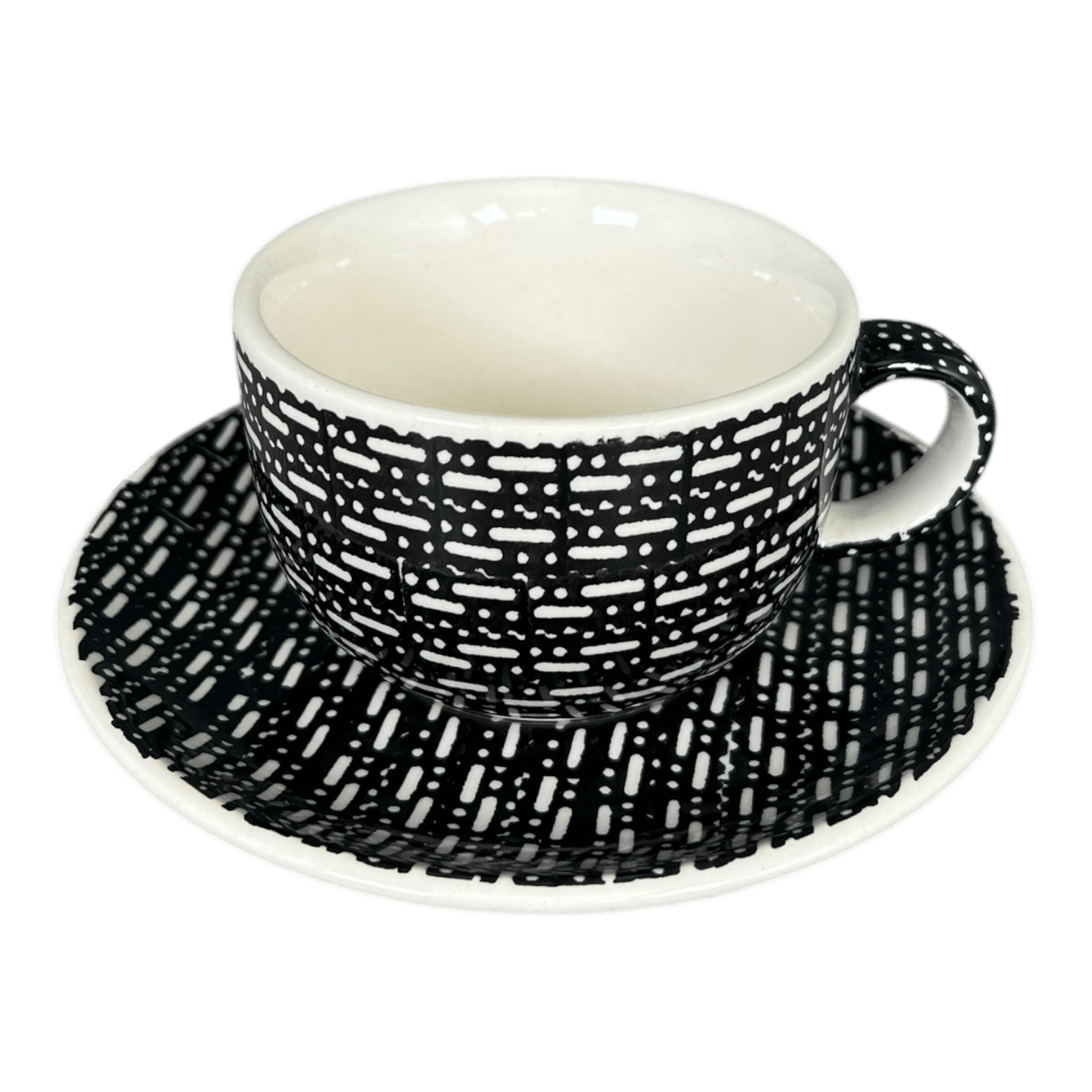 Introducing the charming Polish Pottery Cup & Saucer set from Manufaktura, a true gem in your kitchen collection! Crafted in the picturesque town of Boleslawiec, Poland, this delightful 7 oz duo is not just a vessel for your favorite beverages; it's a piece of art steeped in tradition. The "Metro" pattern exudes elegance with its simple yet striking black background adorned with playful white dashes and dots, creating a dance of contrast that captivates the eye. Perfect for your morning coffee, a soothing tea, or a cozy after-dinner drink, each set brings a touch of European flair right to your table.