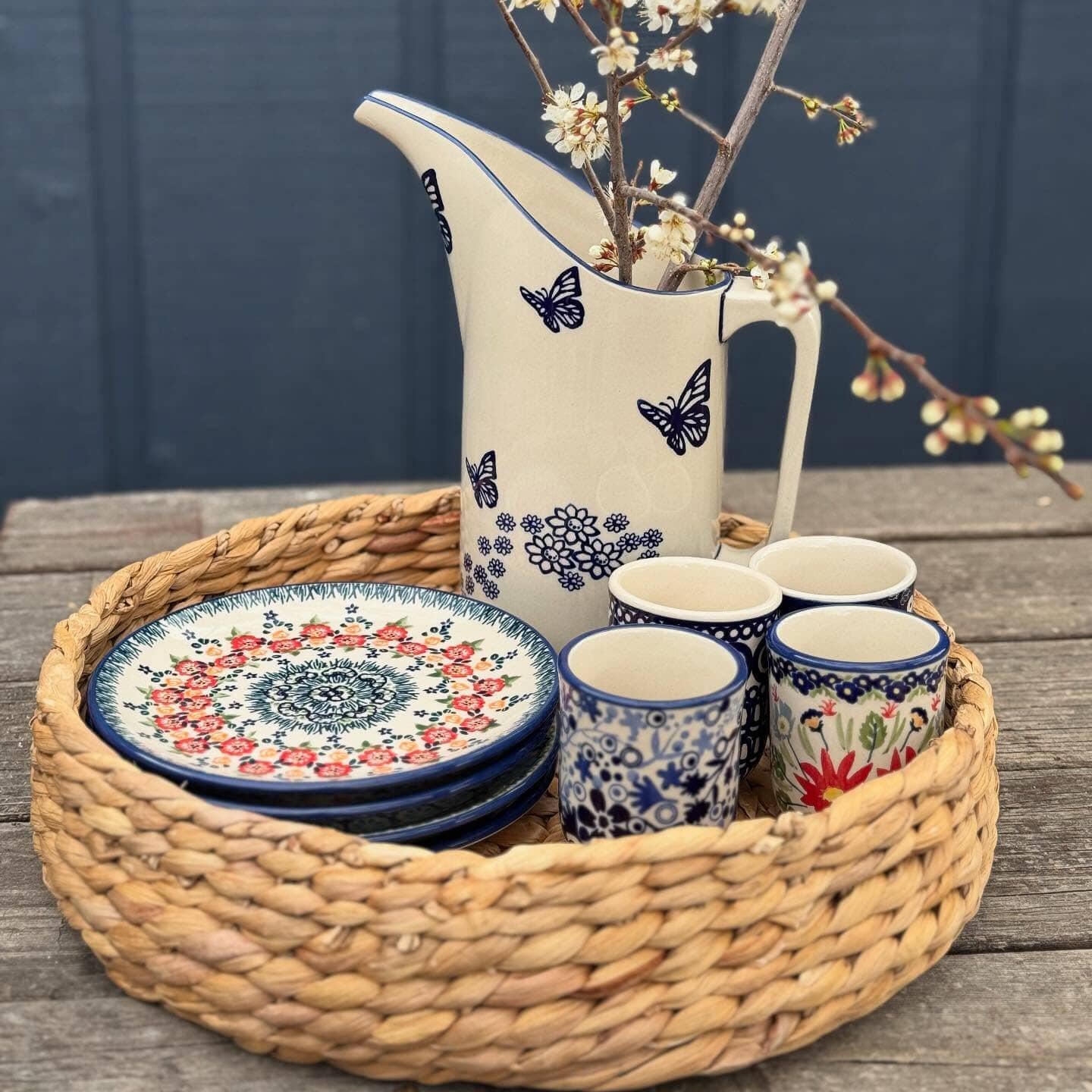The "Butterfly Garden" pattern exemplifies traditional Polish pottery artistry, where each piece tells its own story through unique variations. Crafted using the time-honored "punching" technique of hand stamping, skilled artisans breathe life into the clay, creating a canvas that captures the essence of nature. While these patterns are deemed 'simpler' within the pottery community, their beauty lies in their familiarity and the endless possibilities they present. As this pattern is widely embraced by a large pool of artists, each pitcher is a testament to the collective creativity and craftsmanship that Polish pottery is celebrated for. Measuring an impressive 10 inches tall with a 4-inch diameter, this pitcher not only serves your drinks but also serves as a striking decorative piece.