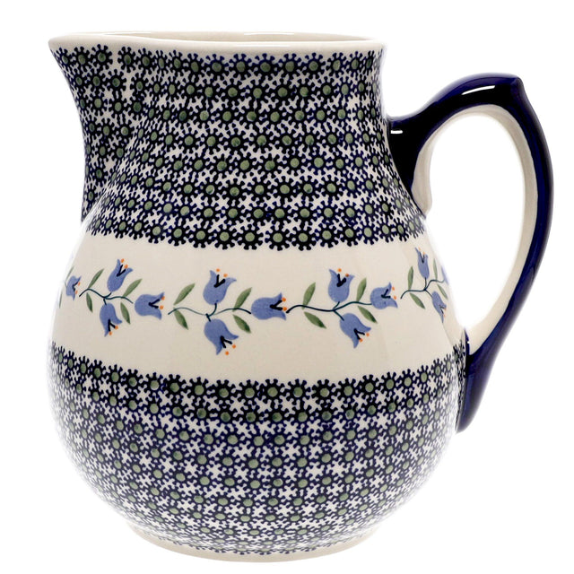 Imagine hosting your next garden party and making a stylish statement with every pour from the exquisite Polish Pottery Pitcher. Crafted by the renowned artisans at Manufaktura, this 3-liter marvel is a true masterpiece, adorned with the charming "Lily of the Valley" pattern. As you gracefully serve Pimm's on the patio or refreshing iced tea on the terrace, this pitcher, with its vibrant display of blue and green blossoms set against a crisp white background, is guaranteed to captivate and impress your guests. Its sleek "Basia" style silhouette, characterized by smooth curves and a narrow neck, not only adds an air of sophistication but also makes it a delightful centerpiece.