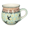 Imagine hosting a grand dinner, where every detail reflects your exquisite taste, right down to the pitcher that gracefully serves sauces or cocktails. Introducing the Polish Pottery Pitcher, a 1.5-liter masterpiece crafted by the artisans of Manufaktura in the enchanting "Capistrano" pattern. This large, wide-mouth pitcher isn't just a vessel; it's a conversation starter. The "Capistrano" design, a harmonious blend of green hues complemented by yellow and brown accents, features charming bird and floral elements that dance on a pristine white background. Small yellow flowers and mint green fronds are scattered across the surface, with black birds in random orientations, giving each glance at the pitcher a unique view.