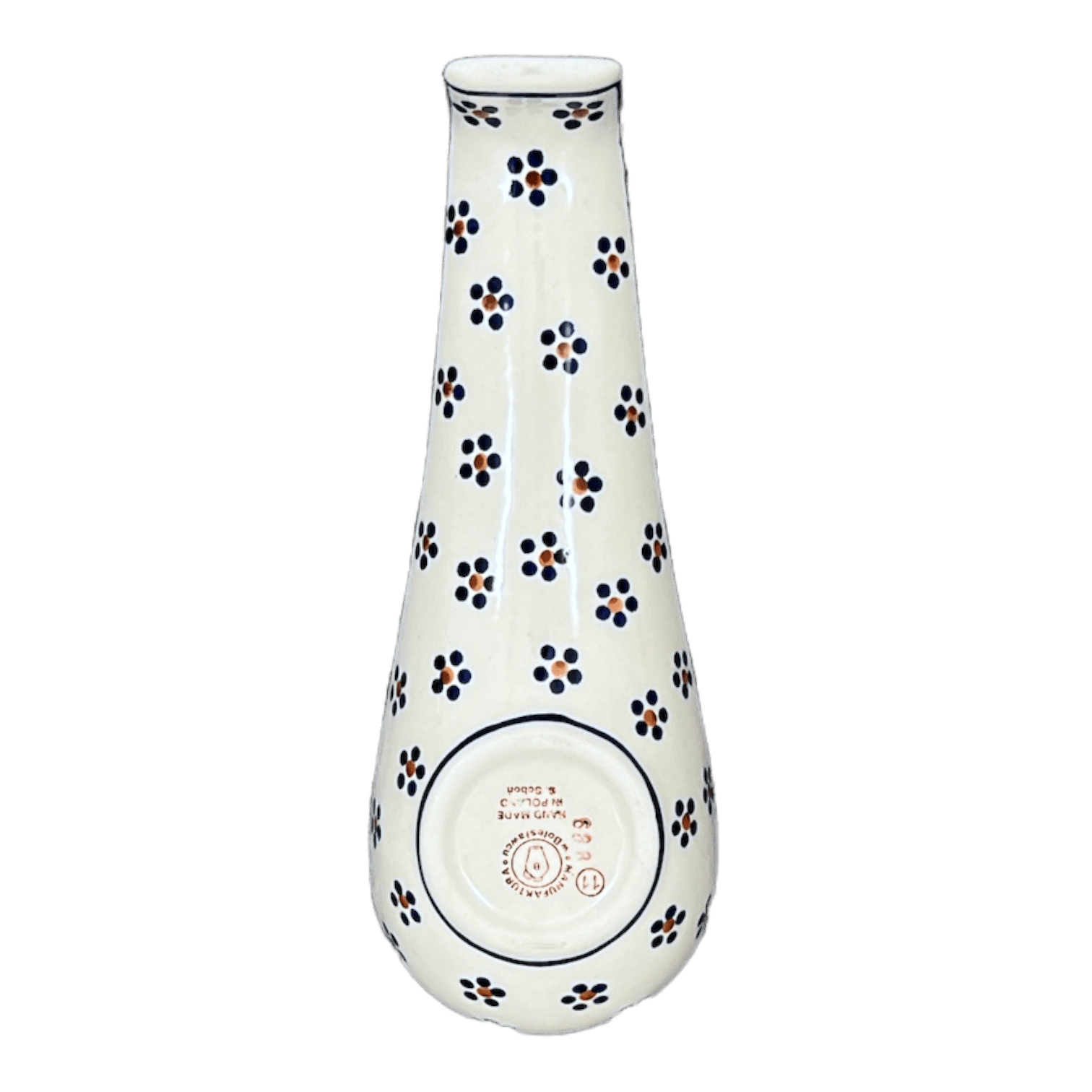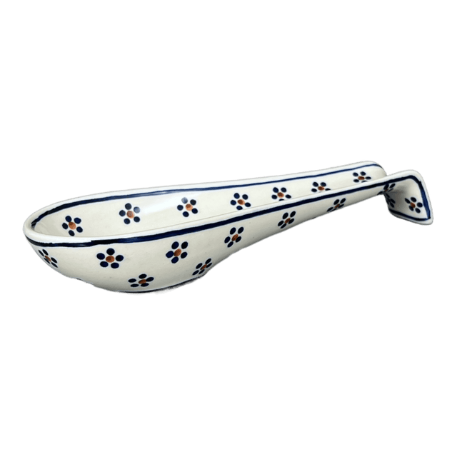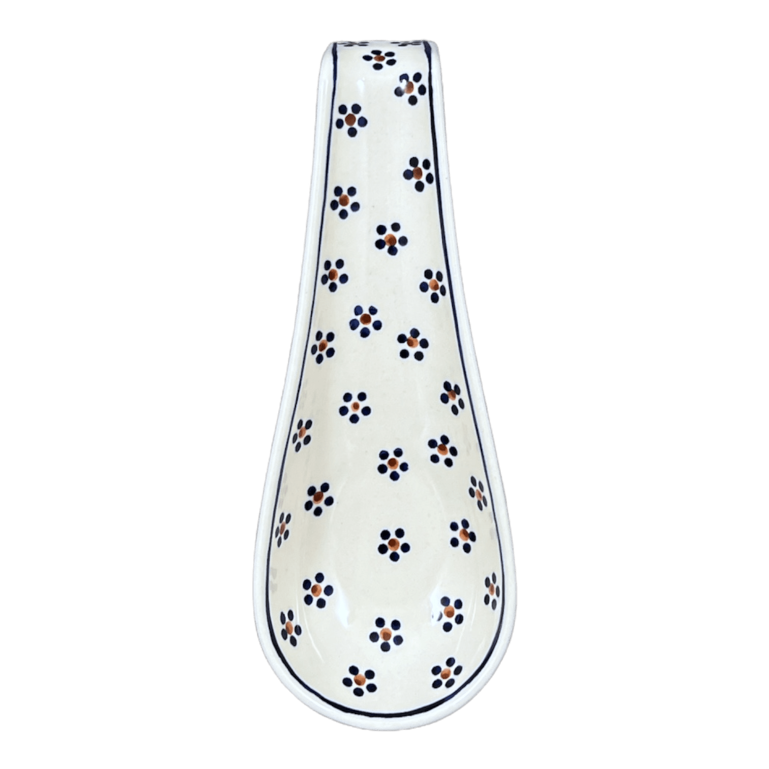 Imagine coming home after a long day, your kitchen sanctuary awaits and so does the charming Polish Pottery Spoon Rest from Manufaktura. Not just any spoon rest, this delightful piece, adorned with the "Petite Floral" pattern, offers your weary kitchen utensils a quaint place to repose. Picture this: a serene white canvas blooming with daisy-like flowers in soothing shades of blue, each petal delicately crafted with five dark blue dots, centered with a quaint brown dot. The artistry doesn't stop there; a tasteful blue lined border dances gracefully under the rim and near the base of the bowl, encapsulating traditional beauty with every glance.