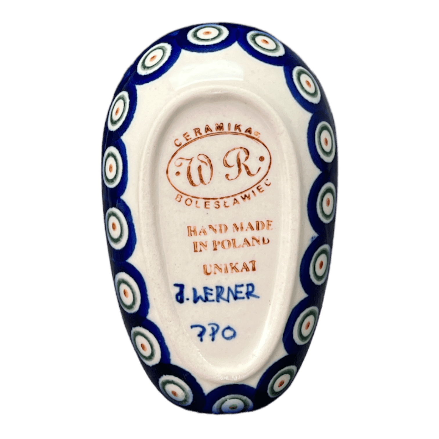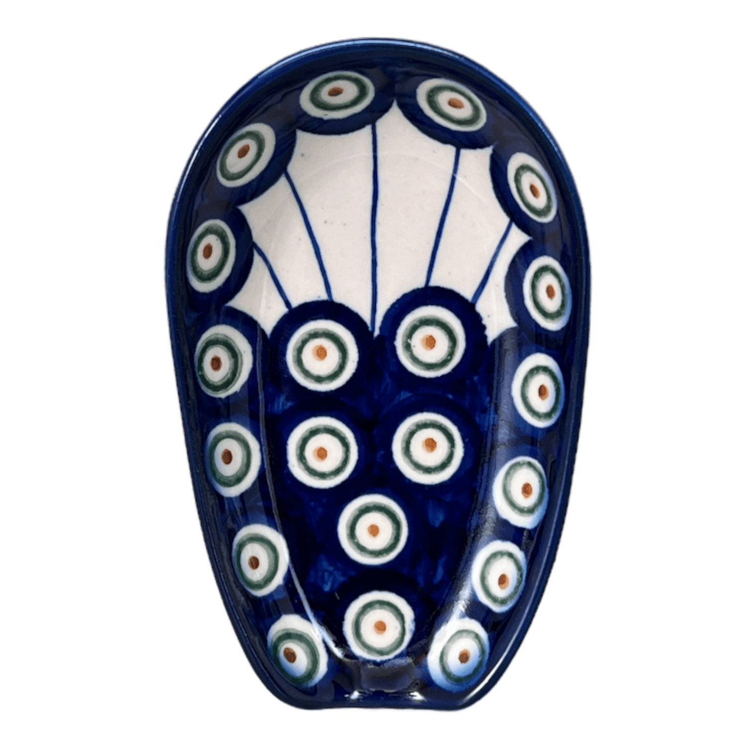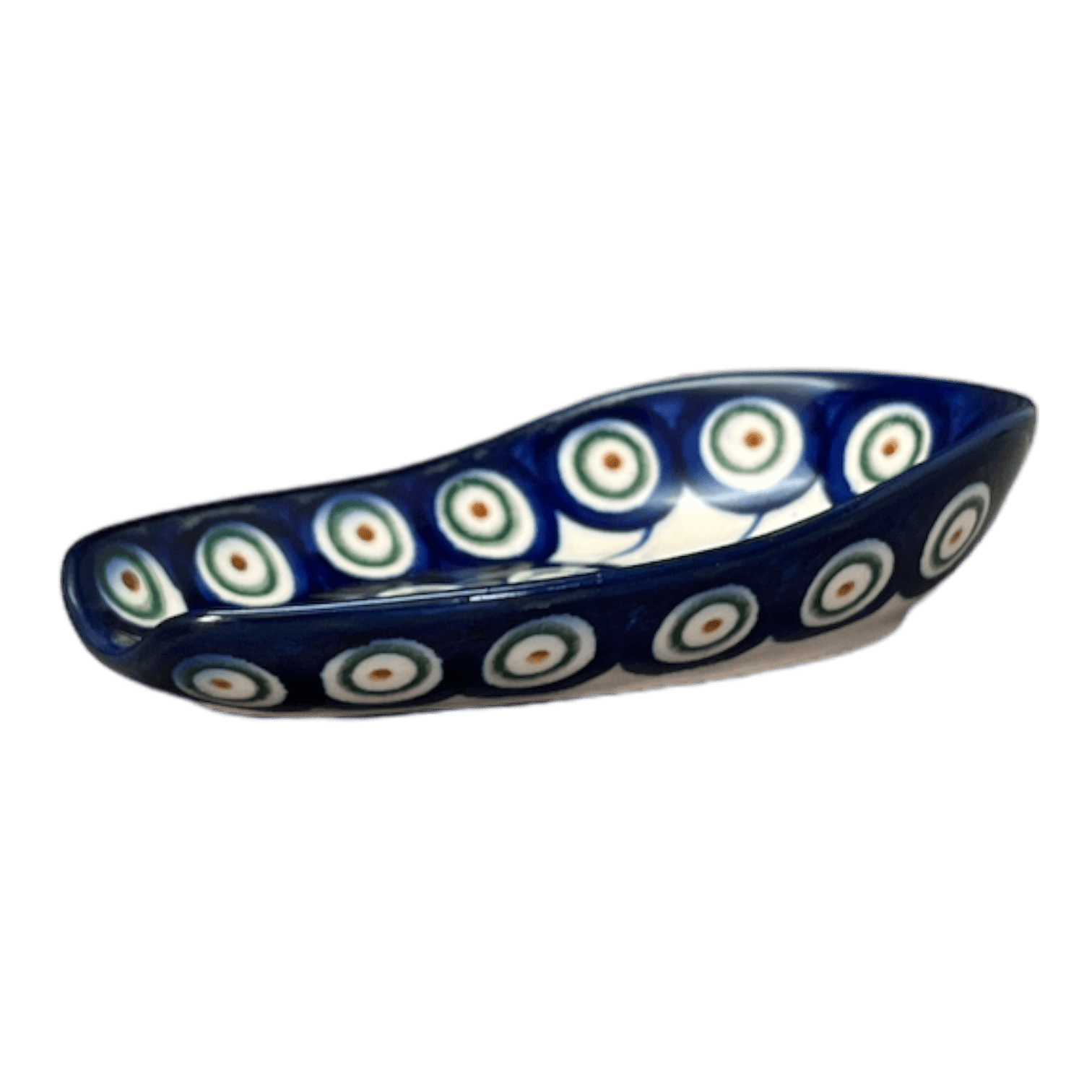Spoon Rest, 3.5" x 5", WR (WR55D) in "Peacock in Line" by W.R. Ceramika | WR55D-SM1 is backordered and will ship as soon as it is back in stock.