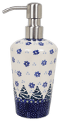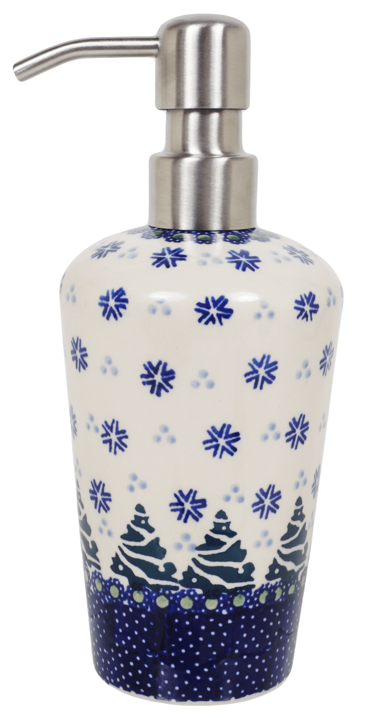 Imagine a touch of enchantment right at your sink with the exquisite Manufaktura Polish Pottery Soap Dispenser. Standing proud at 7 inches, this charming dispenser is not just a container for soap; it's a piece of art. Handcrafted in the heart of Boleslawiec, Poland, the "Snowy Pines" pattern paints a whimsical winter scene in a predominantly blue hue with accents of green and white. Tiny white dots sprinkle over a serene blue background, while bands of teal Christmas trees and simple blue snowflakes dance around the piece, bringing the joyous spirit of Christmas into your home all year round.