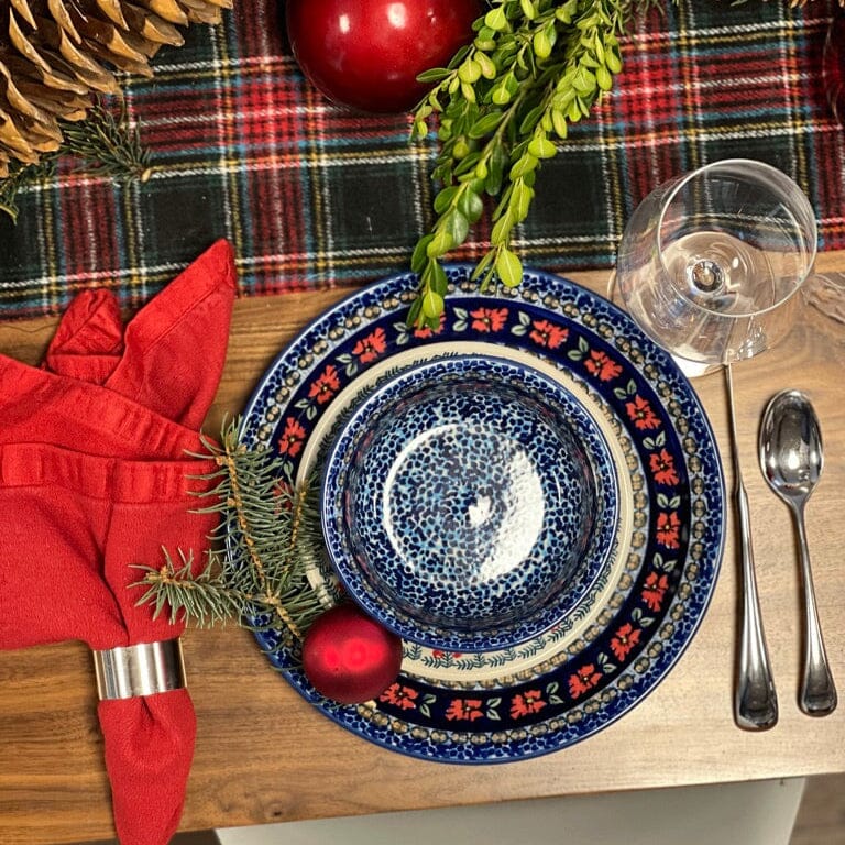 The "Crimson Twilight" pattern is a true testament to the artistry of Manufaktura’s skilled artisans. It features a delightful dance of colors with a light blue background and densely scattered blue dots, surrounded by a charming band of detailed red flowers and small green leaves set against a dark blue backdrop. This design is a part of Manufaktura’s Signature collection, where each piece is meticulously overseen from conception to execution by master artists. These artists, recognized for achieving the pinnacle of their craft, not only design but also monitor every step of the production process, making each plate a limited edition treasure. Adorned with the "UNIKAT" stamp and the artist's signature, each plate carries the soul of its creator, transforming it into a collectible work of art that celebrates exceptional craftsmanship.