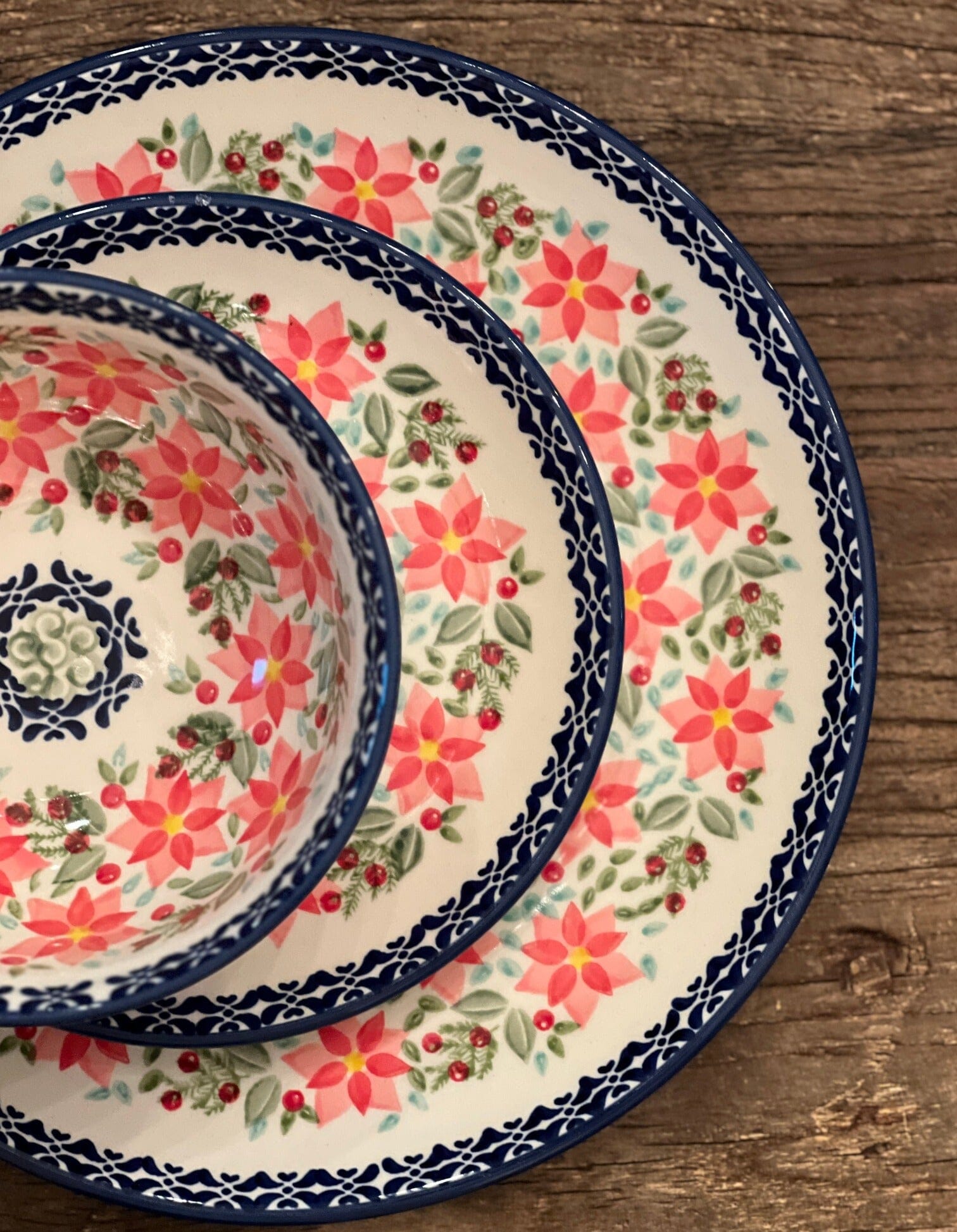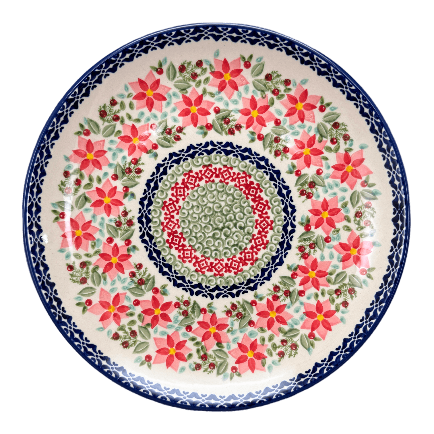 Imagine a dinner plate that does more than just serve food; it serves up a story! Introducing the exquisite Polish Pottery 10" Dinner Plate from Manufaktura, adorned with the vibrant "Pink Poinsettia" pattern. This plate isn't just a dish; it's a canvas showcasing a riot of colors—predominantly pink with festive splashes of red, green, and blue. Rings of pink poinsettia flowers encircle green leaves and red berries, creating a visual feast that complements your culinary delights. Whether you're plating up a family meal or throwing a dinner party, this plate transforms every occasion into a more colorful and engaging experience.