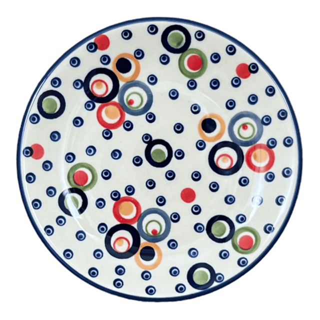 Introducing the delightful "Bubble Machine" Polish Pottery Plate by Manufaktura, a true masterpiece from the heart of Boleslawiec, Poland. This charming 6.5" dessert plate is a canvas of whimsy and color, perfect for serving your favorite sweet treats, tantalizing appetizers, or crusty bread slices. The "Bubble Machine" pattern dazzles with its playful circles and dots, dancing across a pristine white background. Vivid splashes of blue, red, and gold elevate the design, turning each meal into a festive celebration of modern artistry.