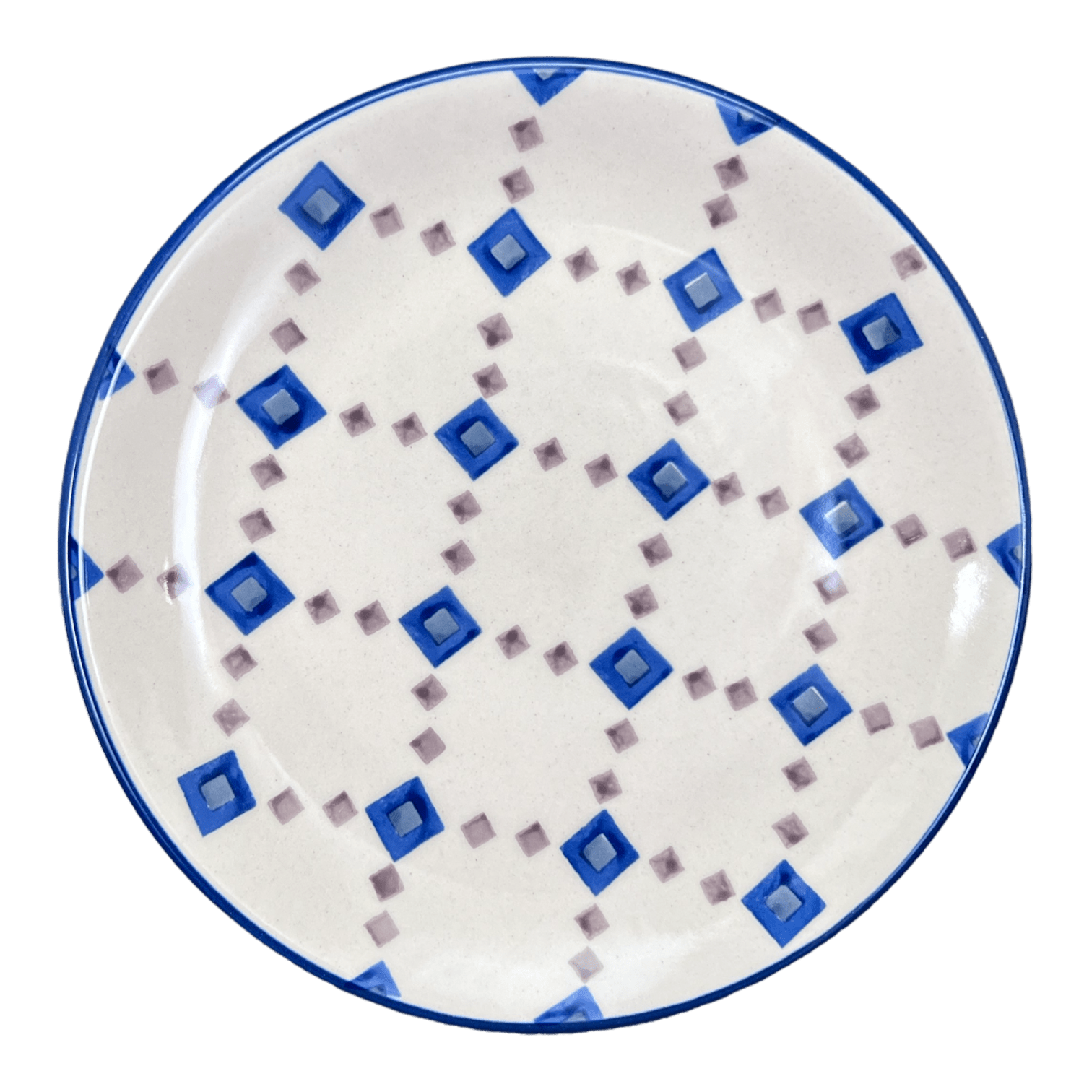 Featuring the captivating "Diamond Quilt" pattern, this dessert plate showcases a mesmerizing blend of geometric shapes in a predominantly blue color with accents in gray and white. It's a design that will effortlessly elevate the aesthetic of any table setting, adding a touch of elegance and sophistication.
