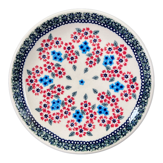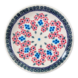The "Floral Symmetry" pattern showcases a stunning combination of vibrant red flowers, delicately accented with hints of light blue and green, all set against a backdrop of crisp white. The design elements are carefully hand-painted by skilled artisans in Boleslawiec, Poland, ensuring each plate is a unique work of art.