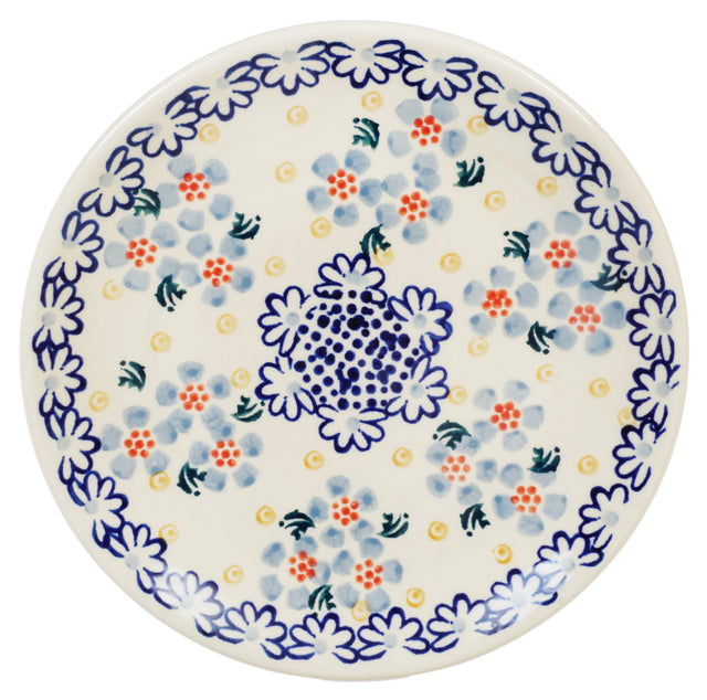 Featuring the enchanting "Periwinkles & Pinwheels" pattern, this plate showcases a delightful design incorporating delicate flowers in a predominantly light blue color, with accents in blue, white, and red. Each stroke of paint is meticulously applied by skilled artisans in Boleslawiec, Poland, ensuring that every piece is made and hand-painted with love and care.
